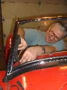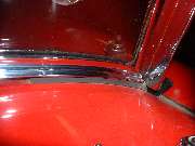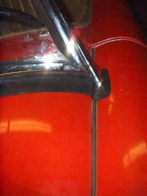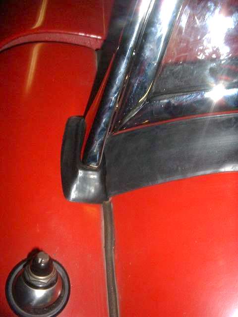 Not easy to see, but directly under my hands in this last picture above there are two 5 inch long foam rubber packing strips on top of the painted body of the car. These are placed under the bottom frame rail and as near as possible to the inside surface of the mounting post. The purpose of these rubber strips is to inhibit the entry of rain water or wind under the corner of the frame. The outer end of these strips may even be positioned on top of the rubber grommet that surrounds the base of the mounting post. The first picture below is a close up of this packing from inside the car after installation.