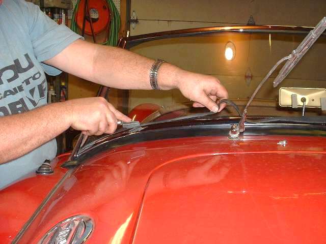 Removing the old windscreen from the car was actually fairly easy. Half of the time here was consumed removing about 30 small screws that retain the interior kick panels in front of the doors. After that just two bolts on each side holding the windscreen side posts to the body of the car, and three small screws on each side that attach the grab handles to the posts, and the whole windscreen assembly lifts out. Then only about 10 minutes was needed to remove 4 screws each side for the side posts, and 4 smaller screws each side for the corner brackets, and the frame pieces were easily pulled away from the glass. And take a few minutes to clean the glass before beginning reassembly. Keep in mind that this one was easy because it was assembled with all new hardware just a few years earlier. If you have to disassemble an original 40 year old windscreen, at least you can expect to break some of the brass screws, and you had best plan on buying all new brackets and a proper screw kit.