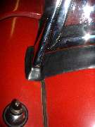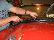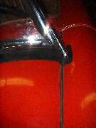 Another small chore requiring a bit of finesse is getting the bottom seal strip to lay out flat on top of the body cowling, especially at the ends. This rubber strip was stored and shipped in a flattened roll wrapped with tape, so it started out with a lot of kinks. I opened it up and hung it over a towel bar above a hot air register in the house for several days prior to installation so it had a chance to relax and get the kinks out. As a final step at installation I used a large scissors to trim the pointed end of the strip near the side post so that it drops down along the grommet at the bottom of the post to lie against the painted body cowling. Start by pulling the end of the rubber strip up tight against the inside of the post. Then position the tips of the scissors at the inside front corner of the post, and the handles of the scissors straight forward above the fender to body joint, and then clip off the end of the bottom rubber seal. When in doubt, take small cuts. It's easy to clip more off later, but not easy to put it back on if you goof. The last two pictures above show the desired final result.