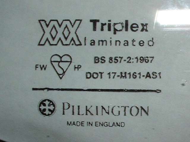 Now the trimming is all finished and it's time to show off a bit. Windex and a soft cloth or paper towel does a nice job of cleaning off the soap and finger prints, and even cleans the mold release agent off of the bottom rubber seal strip. I'm so happy with the results, and this new chrome would do the Harley guys proud. Those two white strips in the center of the glass near the dash mirror are plastic super Velcro strips for attaching the tollway I-Pass transponder box. The last picture here is the glass manufacturer's standard certification stamp, located in the lower corner of the glass. TRIPLEX laminated glass meets the USA safety standard. The lettering bears the US Department Of Transportation safety standard designation. PILKINGTON is the manufacturer's name.