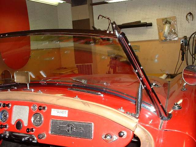 Two pictures on left above show a small brass tapping strip that is held in place in the windscreen side frame by one flat head screw. This strip provides the anchor threads for three of the four screws used to secure the side mounting post. The top screw in the mounting post threads into the bottom hole in the top corner bracket. Here there was apparently a change of tooling somewhere in mid production of the MGA model, such that there can be a slight misalignment of the screws which may require enlargement of one or two of the holes in the side frame. This is a very small change and does not materially affect assembly of the countersunk screws in the side post. Notes in the previous few paragraphs are the reasons why it is necessary (or at least desirable) to preassemble the entire windscreen frame before attempting to install the glass. Having done all this in advance, today's installation was relatively trouble free.