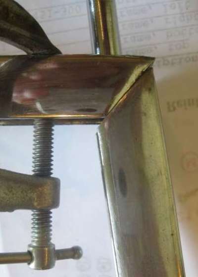 The last picture on the far right above shows a pair of 1/8 inch thick steel spacers that I made to help with the preassembly. The top corner brackets fit with a small gap between the side leg and the inside of the frame of the windscreen. I presume this is intentional, so that in final assembly the screws will pull the frame pieces tightly together at the mitered corner joint without leaving a gap. It all works quite well without these spacers at final assembly, but it was convenient to have them installed while trial fitting without the glass there to hold the parts in correct alignment. Photo at right shows the test assembly without the spacers and the side rail pulled in too far. It also shows the Moss Motors top corner bracket with the top post at the wrong angle (should be straight up).