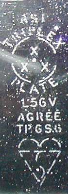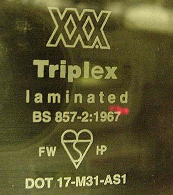 To the right is a picture of the Triplex/Pilkington logo taken from the glass in my car (click for larger image), purchased from Moss Motors in January 1998. This glass is 0.220-0.240-inch thick. Libby Owens Ford (LOF) are the agents for Pilkington (glass worldwide). Pilkington have bought the brand name "Triplex". They have the right to put "Triplex" on any glass they want. The logo is different than the old 50s'-60's Triplex logo some remember, generally described as a heart with three X's inside arranged in a triangle. Any new Pilkington glass will likely bear the new Triplex logo seen here.