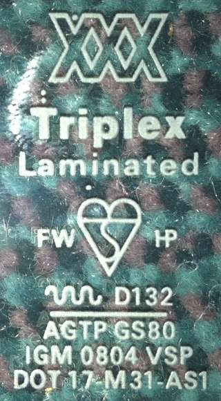 "XXX with a dot in the top of the first X. Triplex with two dots above the T. Laminated with a dot below the "mi". Then the FW hart. Then sqiggle D132. Then AGTP GS80. Then TGM 0804 VSP. It is 0.274-inch thickness".