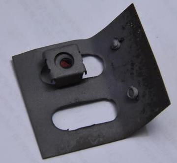 Here is a picture of Item M bracket and one piece Item 22 cage nut. Notice the bracket is hosting two pop rivets which may or may not be original. It has been reported that 1/8-inch aluminum pop rivets were used here (sometimes), and that they will dissolve if/when the car body might be chemically dipped to strip to bare metal. So you should remove these brackets before having the body dipped.