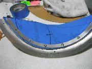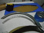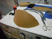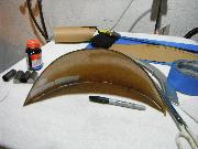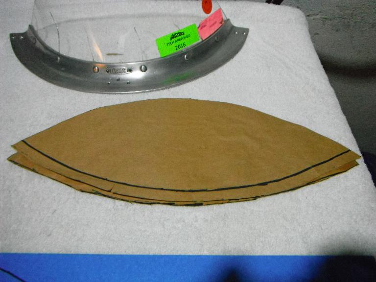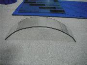 I planned to use a jigsaw to cut my piece and I wanted a sharp blade. Went to Home Depot and picked up a 36 teeth per inch metal cutting jigsaw blade. While there, I also picked up a small 6” x 8” piece of Lexan to use as a test mule. My initial efforts were promising. The saw blade worked fine and left a smooth cut on a 2” strip of Lexan. I heated up the oven and worked my way up in the temperature range. At about 325 degrees, the Lexan became pliable, but still too stiff. But at about 350 degrees it was easily bent. I pulled it out of the oven and draped it over the side of my wife’s biggest pot covered with a cotton towel and ended up with this. Very promising indeed! I was still uncomfortable with my template, and decided that it was time to dismantle my windscreen. This was riveted together and required that I drill out the rivets. Once apart, I made a new template using the rubber cement and paper technique.