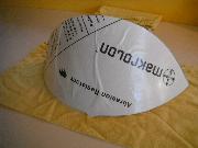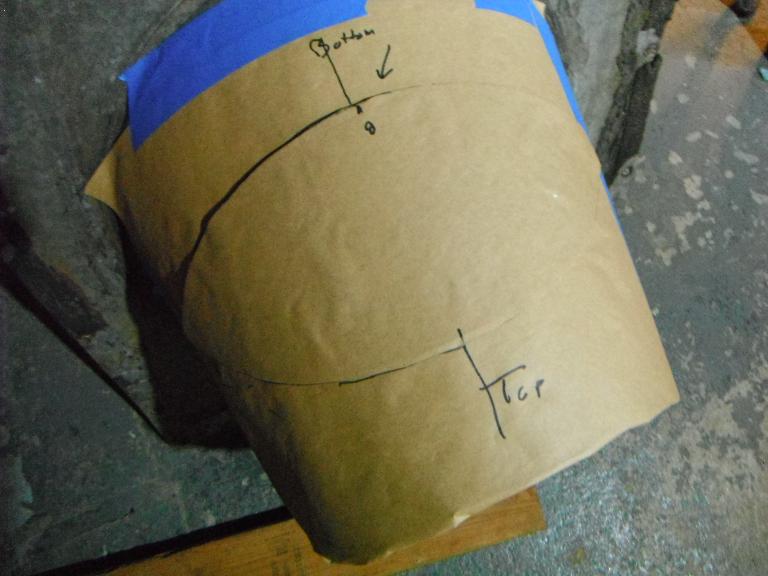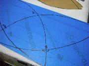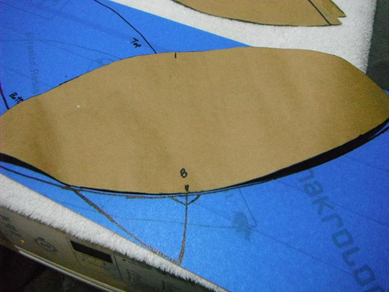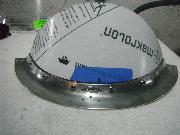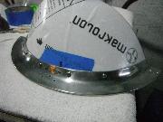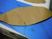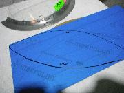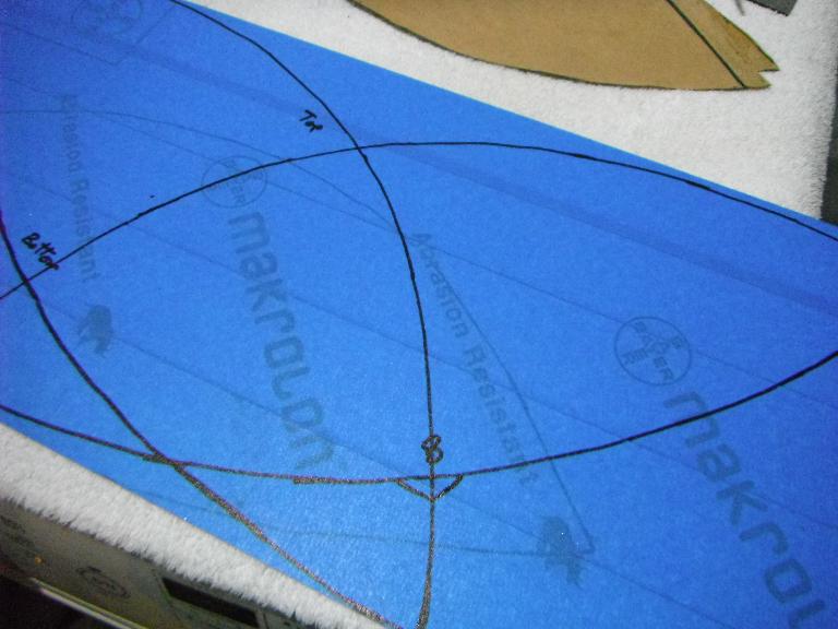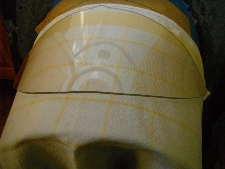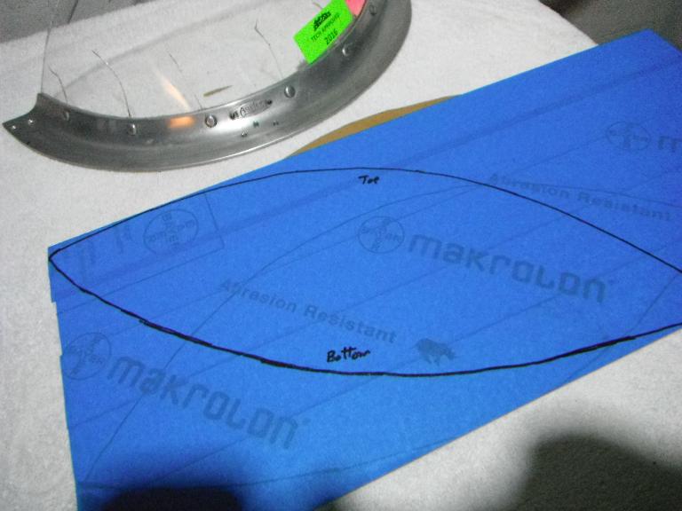 Afraid to rip apart the windscreen, I attempted to make a template for cutting my piece. With rubber cement, I glued some paper to the inside surface and then marked my lines and cut the template. But when I laid it on the outside of the windscreen, it seemed too small. So I followed the same process – rubber cement and paper – on the outside and made a second template. When I laid them over each other, I came up with a new form! Initially I used this combined template to mark out my cut on the Makrolon.