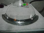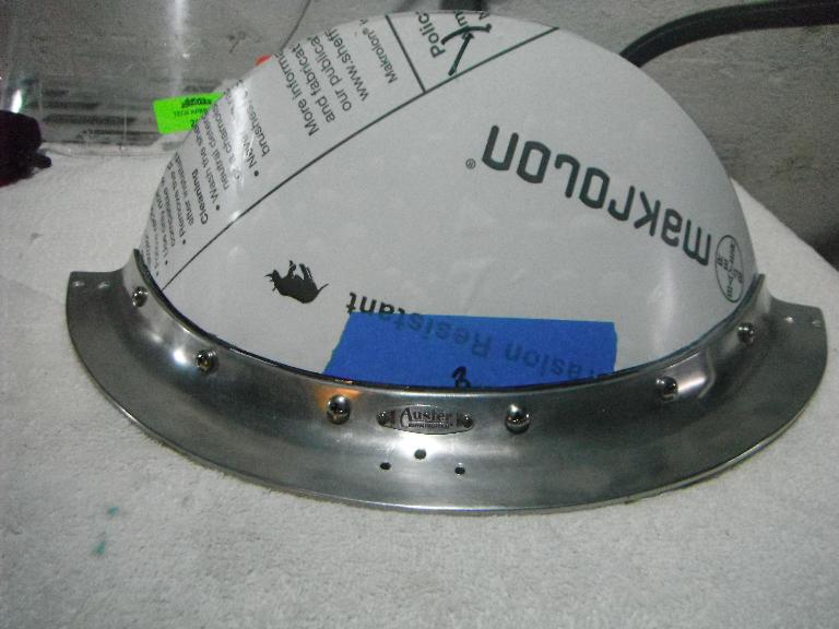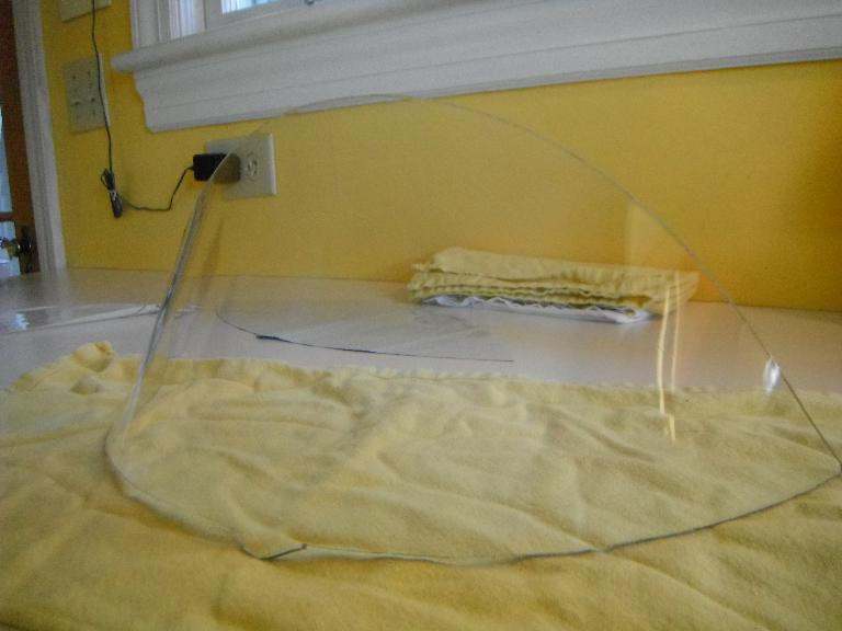 I laid out the new template on my piece of Makrolon. Because the bottom and the top were so similar in shape, I left a “tab” along the bottom surface that I would later remove once the piece was shaped. Now it was do or die. I felt I had only one shot to form my piece, so I experimented some more with the Lexan and with the scrap piece of the Makrolon. I wasn’t sure if the Makrolon would react the same way as the Lexan since it was “abrasion resistant”. I would lay my piece on an upside down cookie sheet for the heating process. Of course, it was important to remove the protective sheeting on the Makrolon before heating! Experimenting, I determined that heating to 325 degrees for more than 5 to 7 minutes simply wasn’t enough for the polycarbonate pieces to become pliable. Heating to 375 degrees for the same amount of time caused internal bubbles to form and ruined the piece.