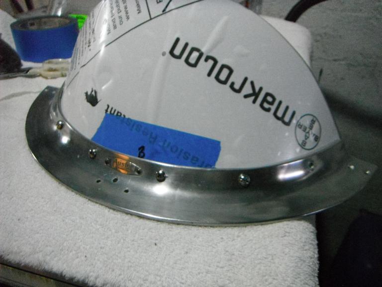 With a big caveat, a preheated oven at 350 degrees seemed to be the sweet spot. Experimenting with smaller pieces cut from the Lexan and Makrolon, however, revealed that 5 minutes at 350 degrees was too much, causing the internal bubbles and ruining the piece. But at 3 minutes, the pieces became sufficiently pliable to bend over my form. I took the decision to heat my windscreen piece to 350 degrees for 3 minutes. Aargh! That didn’t work. When I pulled it out of the oven, the piece was still too stiff to bend. I let it cool down for about 10 minutes and started over. This time I heated to 350 degrees for 4 minutes, all the time worried that bubbles would form and ruin my piece. But at four minutes, the piece was pliable enough to drape over my form with some pressure from my hands. (I draped a cotton towel on my form and flipped up the excess over the hot plastic as it cooled). This is the result. I returned the protective sheeting back onto the surface of the Makrolon and I now needed to do some drilling along the bottom and some sanding of the top edge. Here you can see the little tab that I left to identify the bottom. I cut that piece off and remarked my piece for fitting.