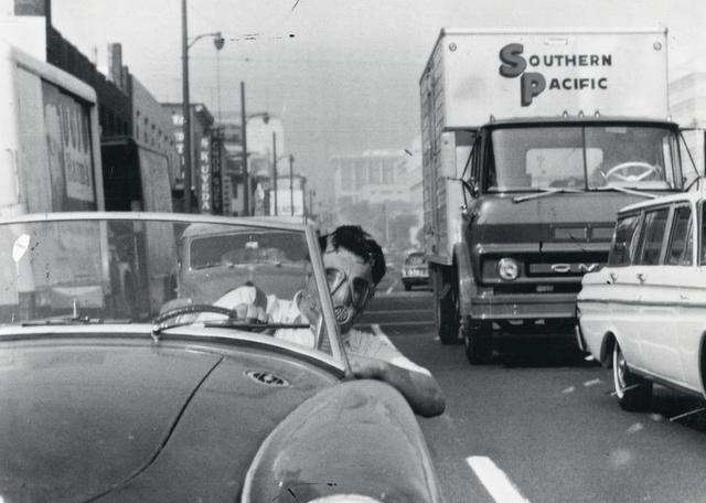 "The smog isn’t quite as bad as Fernie Payan, 24, makes it seem, but he caused quite a stir driving about the city on Oct. 29, 1965 wearing this gas mask. Los Angeles was suffering through its third straight 'smog alert' in three days. ....Press photo from an unknown newspaper."