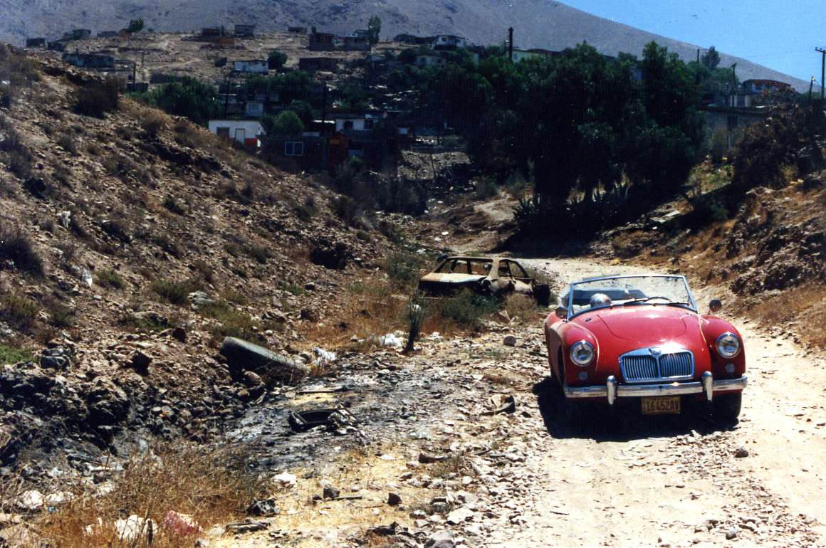 This road on the southeast corner of Tijuana, Mexico, requires that never say die attitude. The car is still red here, but by the time it ran the hill and returned, you couldn't tell what color it was for all the dust. And, you also couldn't tell the color of the trailer, or the color of the driver and navigator. It was fun in the sun once, but I don't think we'll run that road again any time soon.