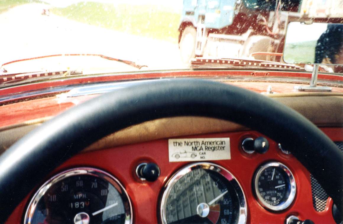 Early in the Brit Run To The Sun - Alaska '97, The MGA with an attitude was towing the luggage trailer through Montana (daytime speed limit = "Reasonable And Prudent") with a Morgan Plus 4 from Dallas, Texas, in close pursuit. The picture was taken via the driver's left hand above his shoulder as the 18-wheeler on the right was being overtaken (on an upgrade). The dashboard instruments pretty much tell the rest of the story, especially the temperature gauge creeping into the oil pressure range.