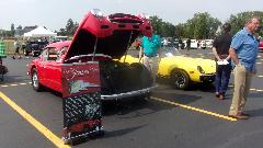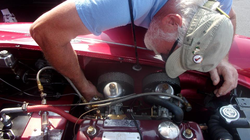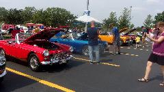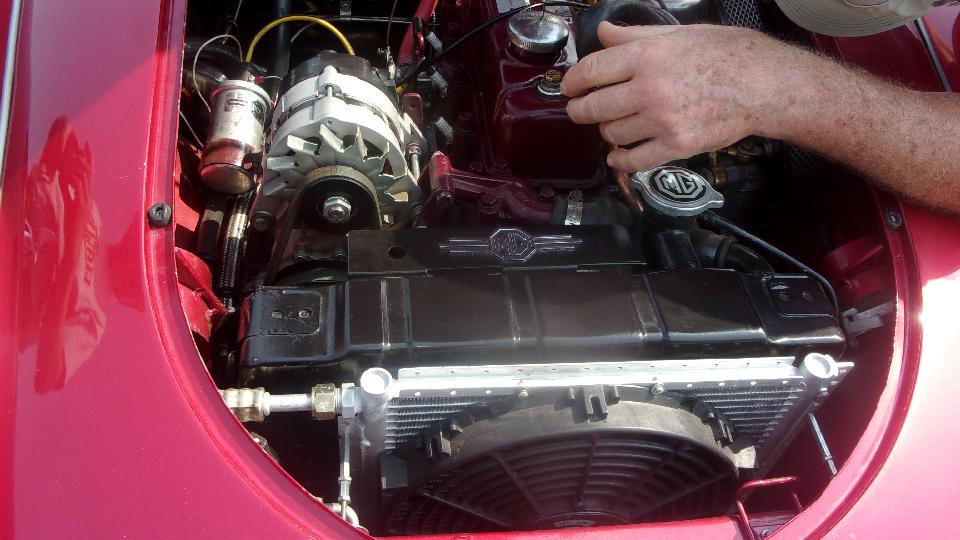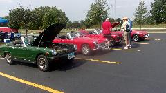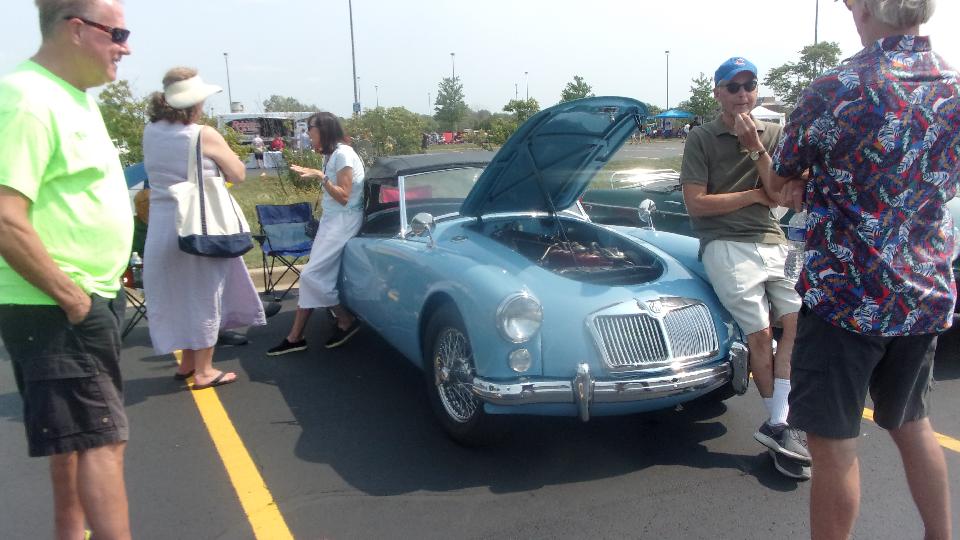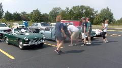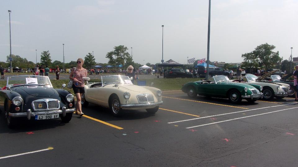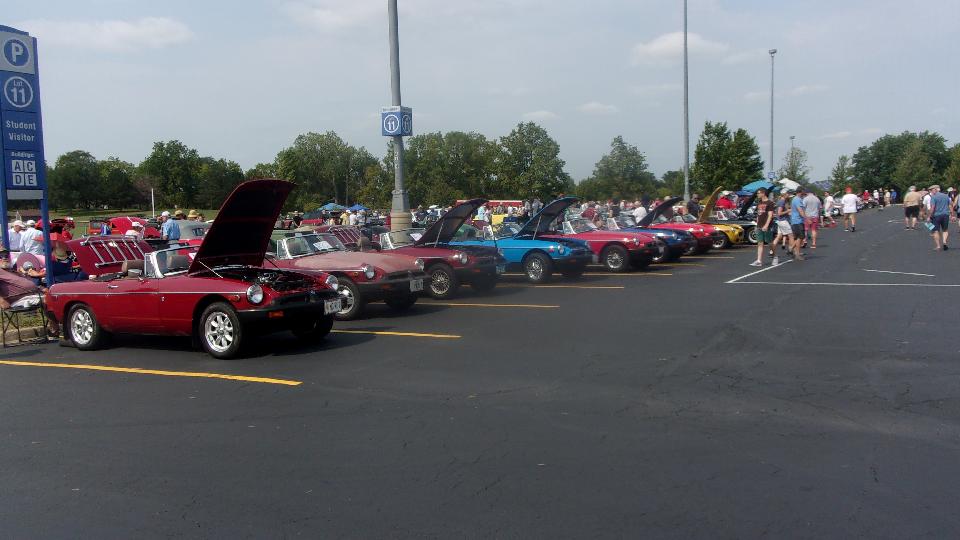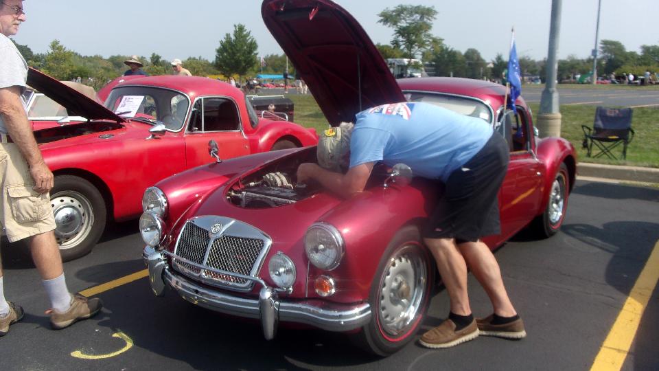 Ah, the annual British Car Festival, at Harper College in Palatine, IL We arrived fairly early, so took time to chat with a few MGA owners first. Right out of the box came a request for an SU wrench to help adjust fuel mixture on a nice MGA Coupe. Easy enough, quickly done. Notice position of the alternator in the third picture, and the thin radiator up front, due to installation of the air conditioning system. Typical MGB compressor bracket with the alternator mounted above the compressor. Slight interference there required moving the bonnet prop rod to opposite side, and fabrication of a special prop rod socket long the left side bonnet gutter. Also notice the knock-off steel wheels and four wheel Dunlop disc brakes, all part adapted from an MGA Twin Cam, but the car is still not a real "Deluxe" (standard type master cylinder).