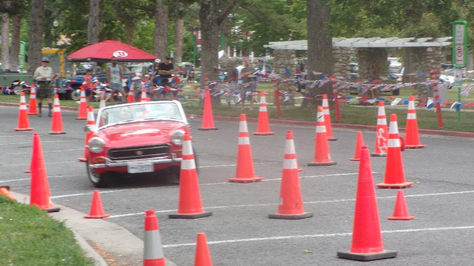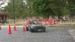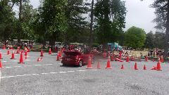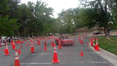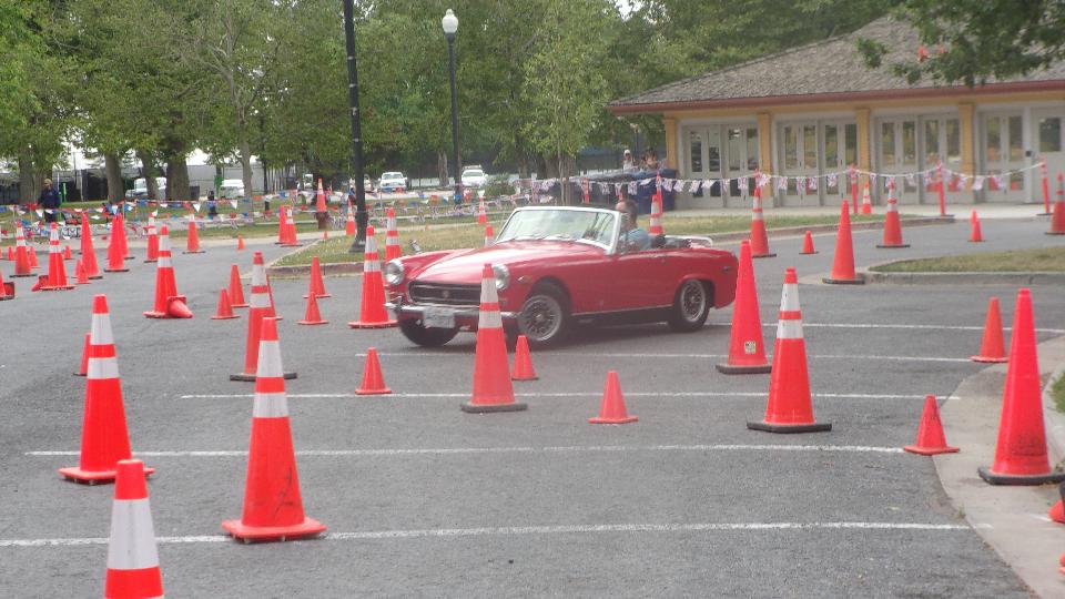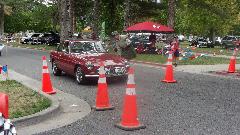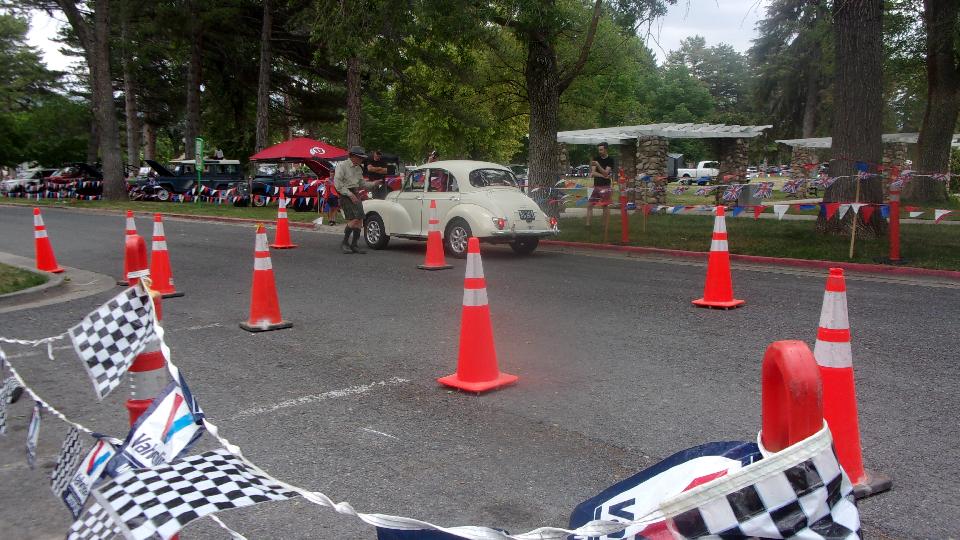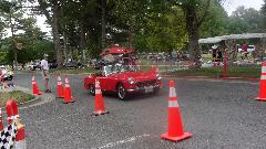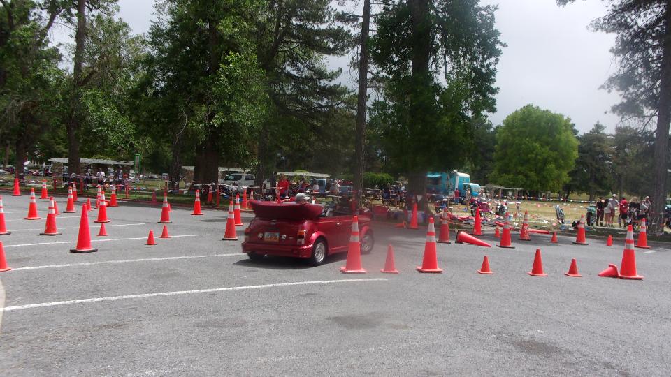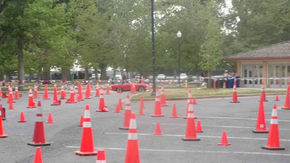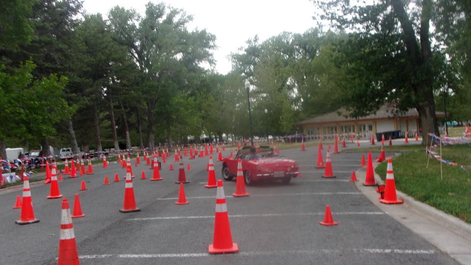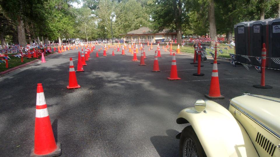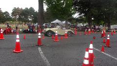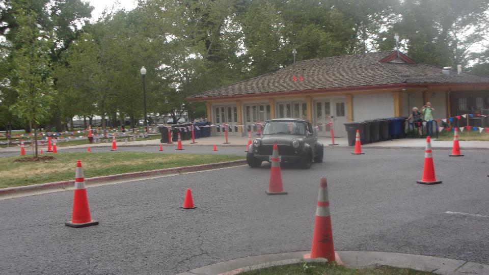 The other corner of the park was getting noisier as the fun runs were warming up. The autocross course was crammed into a small space about a block long with a cul-de-sac loop in front of a club house. For sure no car would get out of 1st gear today, as this sea of cones wa set up really tight and squiggly. The Morris Minor did okay, demonstrating that there is a definite advantage to being small.