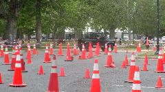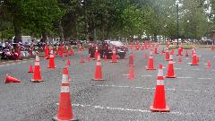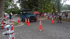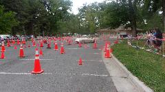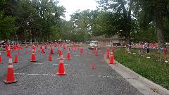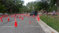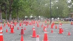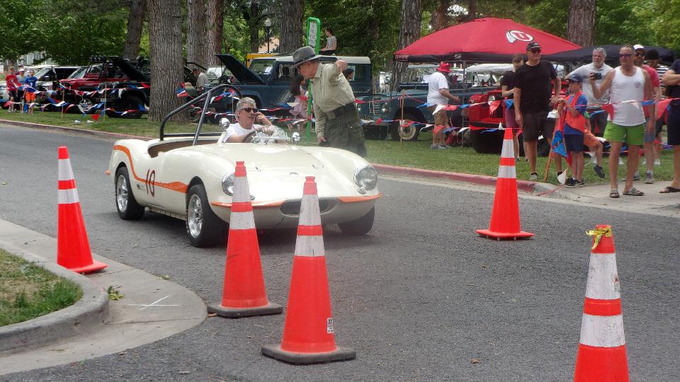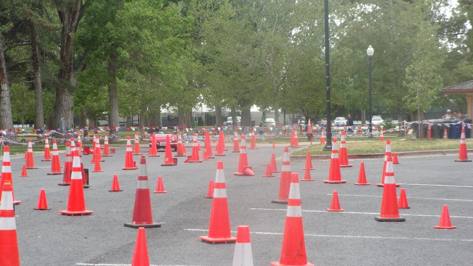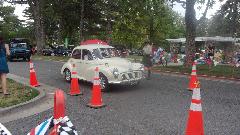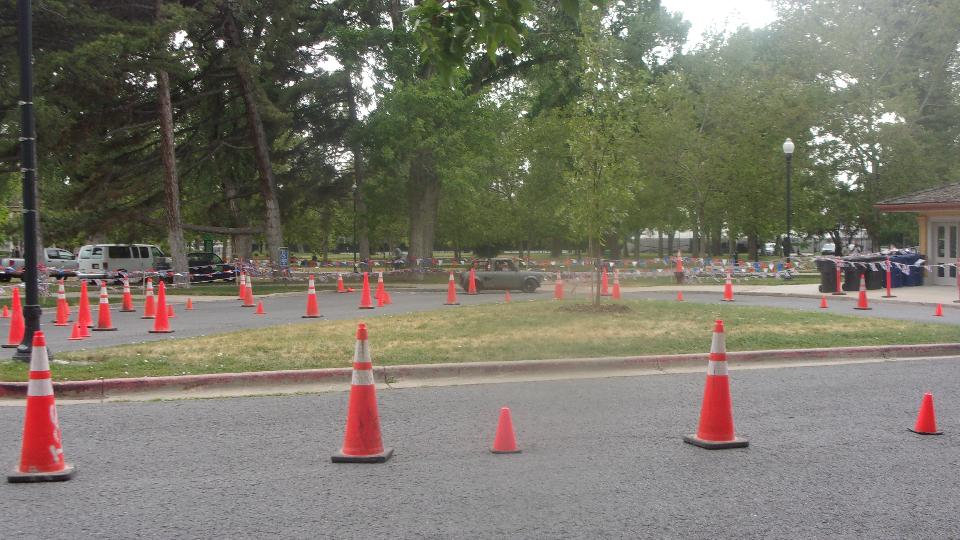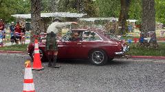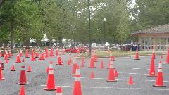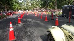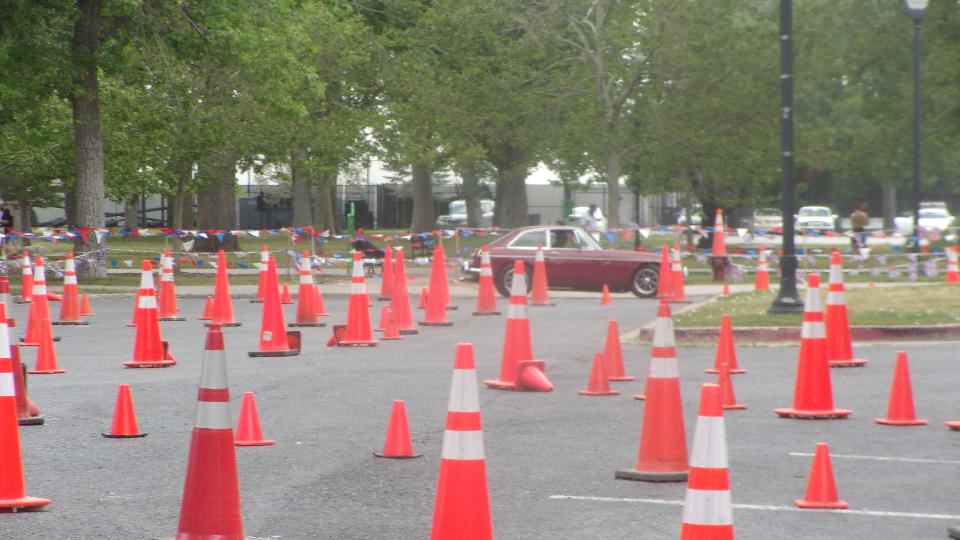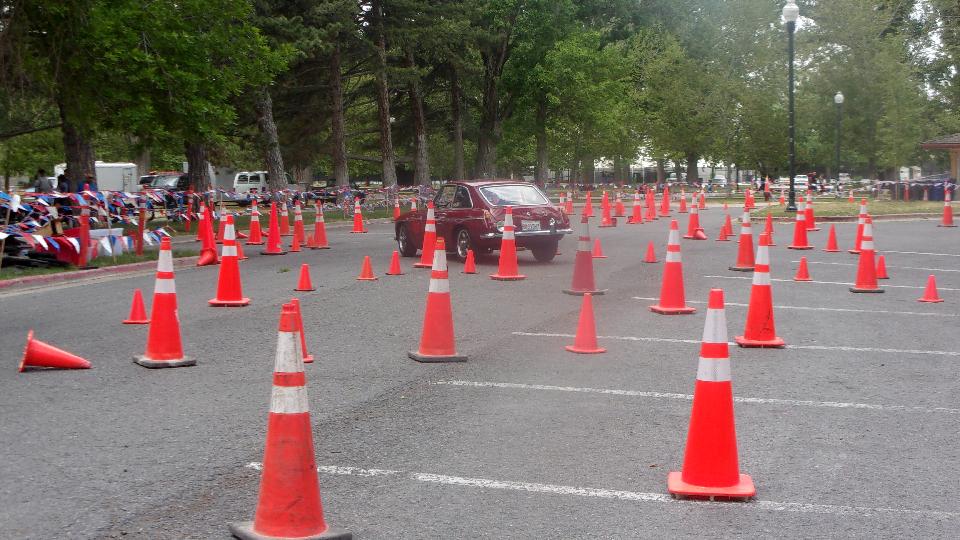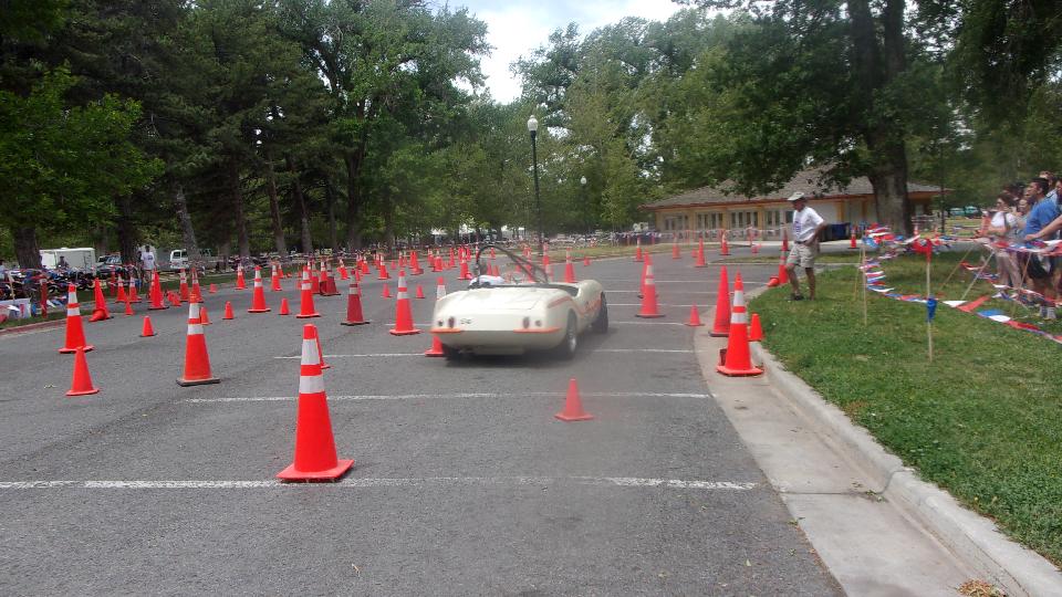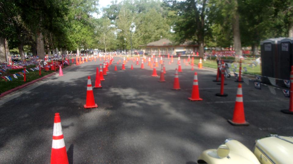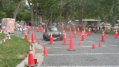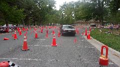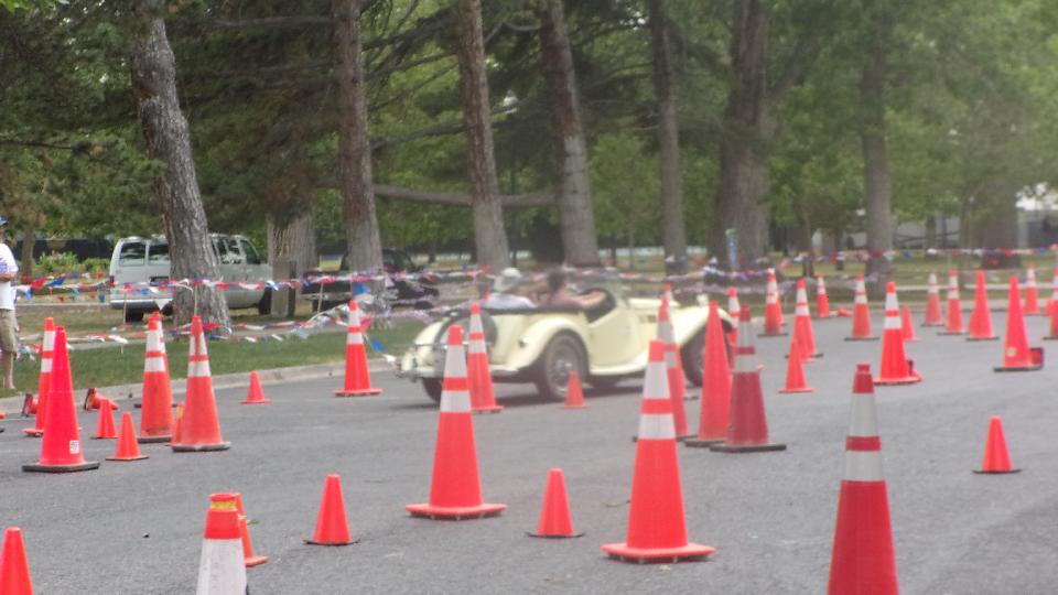 The other corner of the park was getting noisier as the fun runs were warming up. The autocross course was crammed into a small space about a block long with a cul-de-sac loop in front of a club house. For sure no car would get out of 1st gear today, as this sea of cones wa set up really tight and squiggly. The Morris Minor did okay, demonstrating that there is a definite advantage to being small.