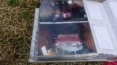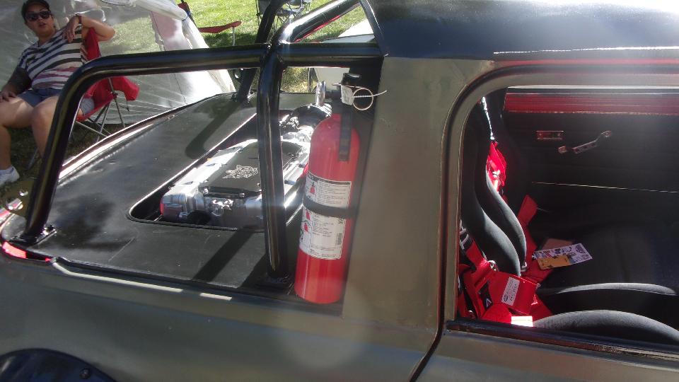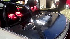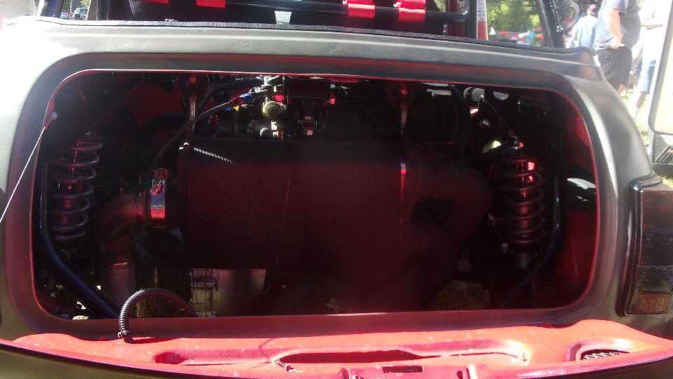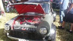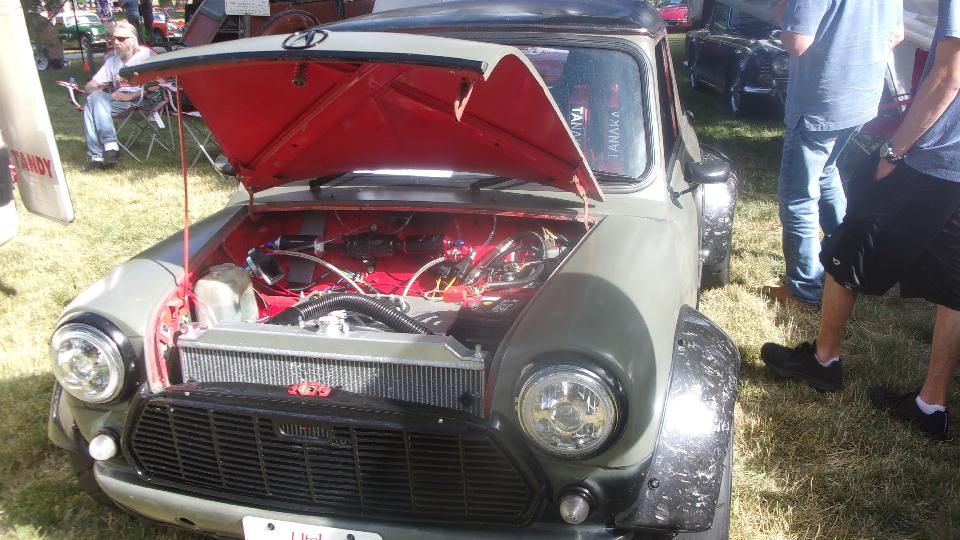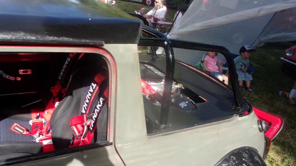 Then my special find and star of the show. First thought was customized Austin Mini, but wait, that's a fuel cell in front where the engine should be. And it's a two seater, no back seat, so a sport coupe? Then we find the engine behind the seats, a mid engined Mini, an it's a fully prepared race car.