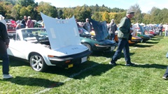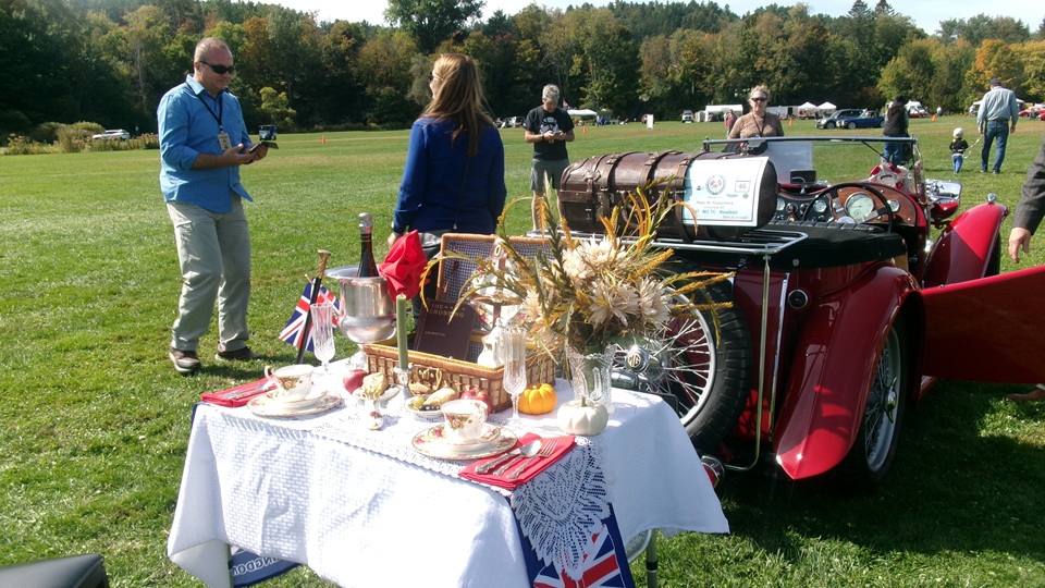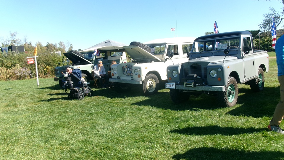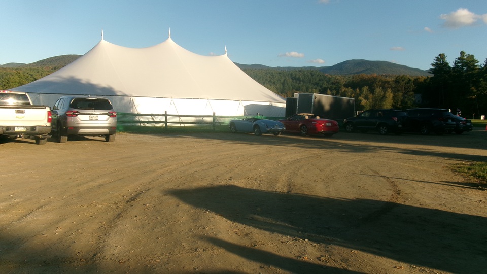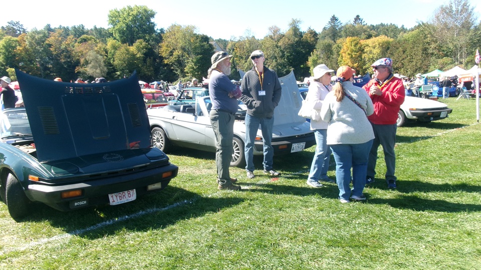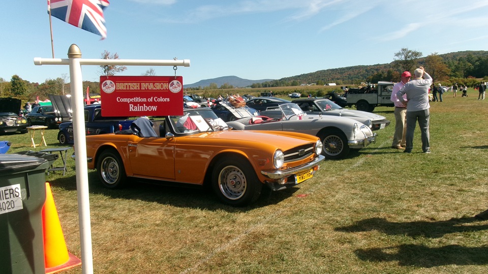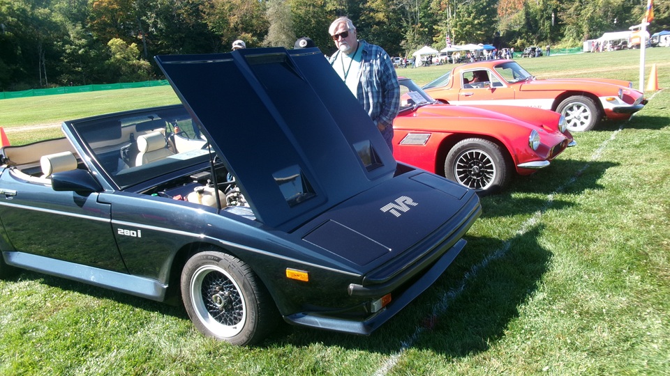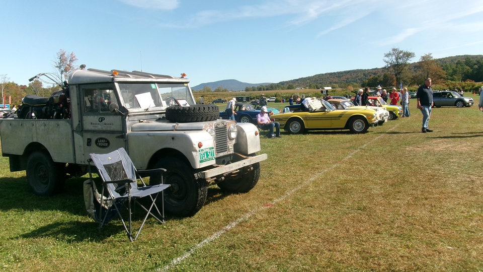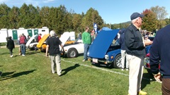 First incident for the week end was a dent in the LR fender of a Triumph, lightly grazed by a big Jaguar sedan. We picked up the registration packet, grabbed a beer and sat to chat with a few folks.