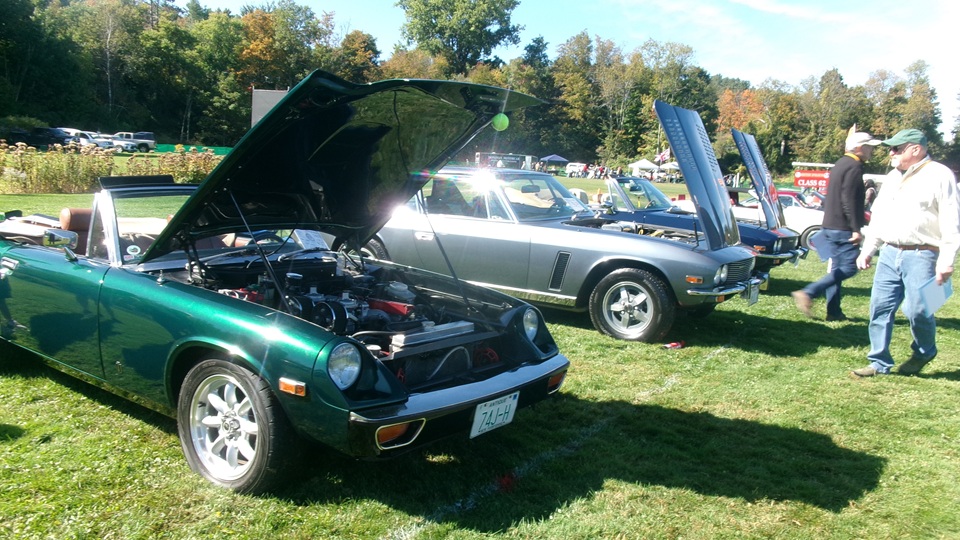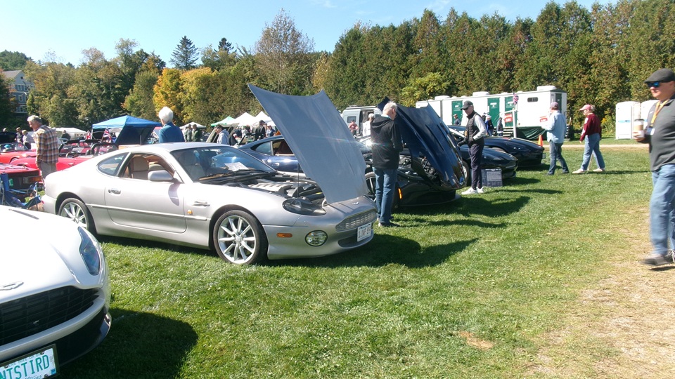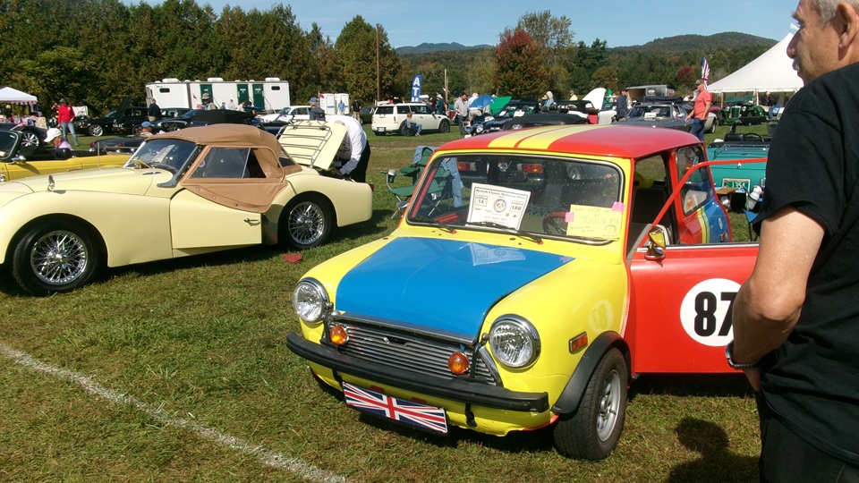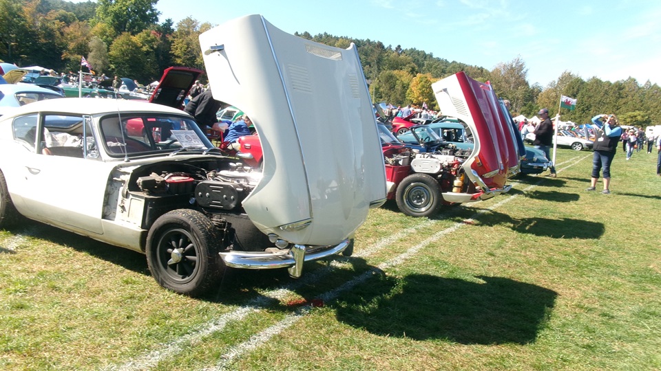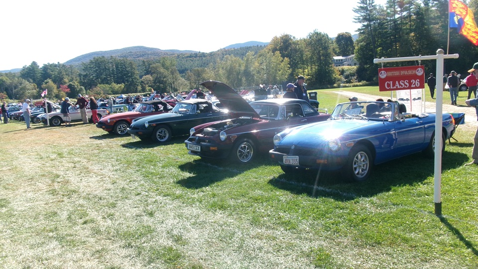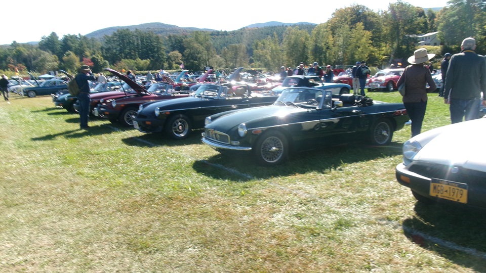 Then heading north through Vermont for an 5-pm appointment to check into The British Invasion car show in Stowe, Vermont, Turned off of VT-108 onto I-89 north, and promptly blew a head gasket while winding the engine up for the long uphill entrance ramp. Bummer, we don't have time for this right now. Cursory inspection revealed combustion gas blowing directly tout the back of the head gasket at the rear head bolt location. Hadn't seen failure at that location before. Oil pressure and water temperature okay, doesn't look to serious, so we opted to remove #4 spark plug to kill combustion and drop the pressure, and drive on running on three cylinders. Sounds like a Briggs and Stratton single cylinder with a bad muffler, but it runs pretty good on three cylinders. We cruised into the car show registration at the Stowe fairgrounds right on schedule at 5:30-pm.