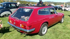 The red shooting brake style car is a 1973 Reliant Scimitar. The big black and cream car is a 1951 Alvis TA-21. Of course the little two-tone green and white cars are Metropolitan.