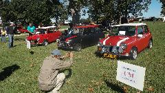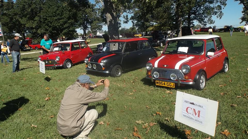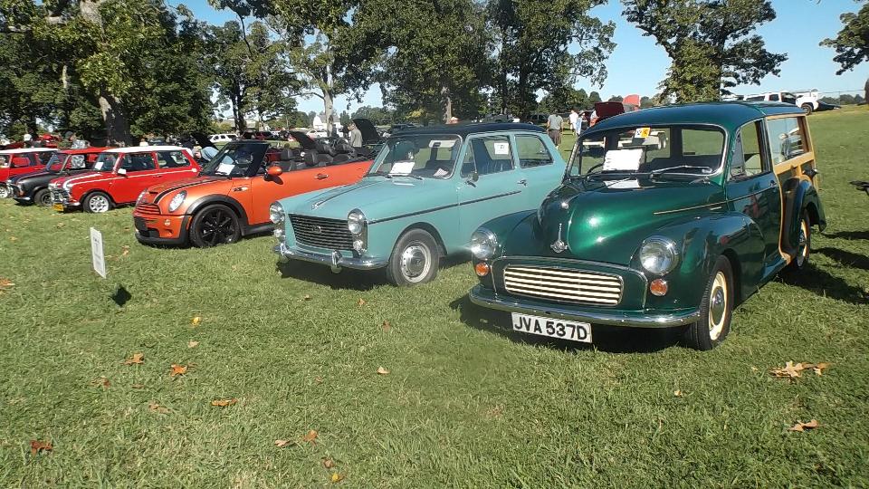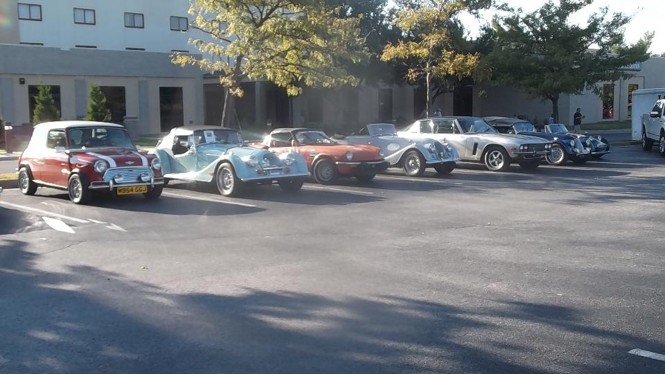 First below, left to right Morgan Aero 8, Plus 4, and Plus 8 (I think). Center, right to left Morris Minor Travler, Austin A40, and a "new" Mini. On the right three vintage Minis.