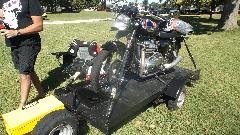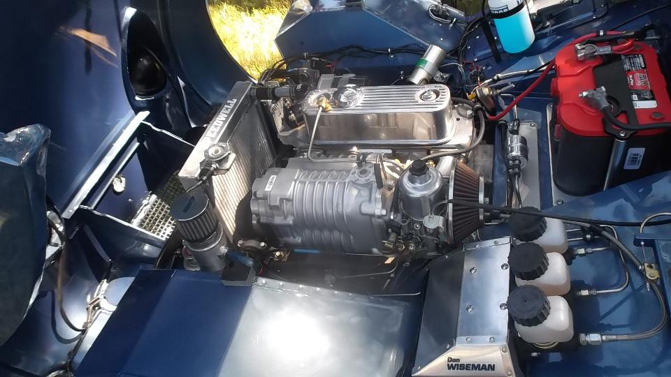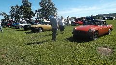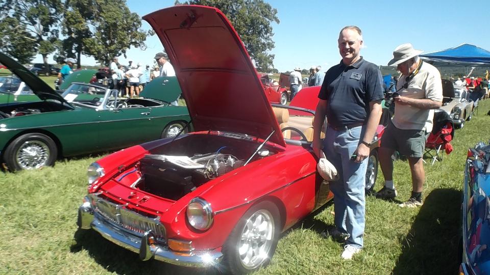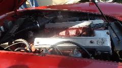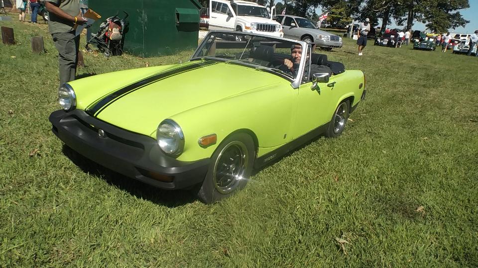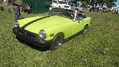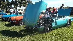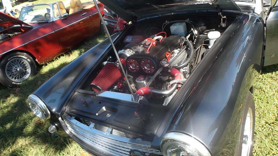 Modified MGs here, an MGB V6, couple of V8s. Car on right is a 1975 MG Midget with 1995 Dodge Avenger engine, 2-liter DOHC Turbo charged plus nitrous oxide, said to dyno 395 HP. Once ticketed for doing 130 mph, and pretty sure he was not using NOX at the time. Very light steering at speed, needs a front air dam. The Triumph motorcycle was being towed behind the modified Midget.