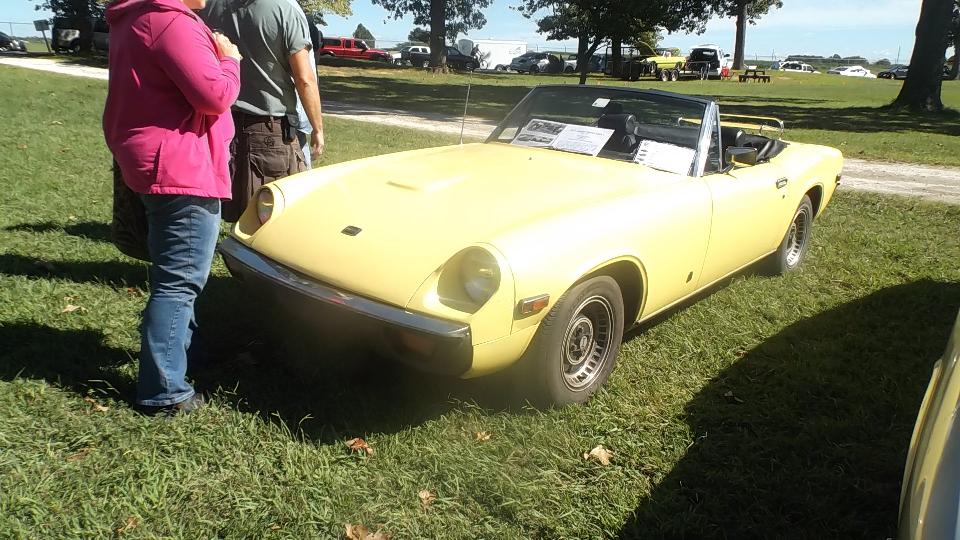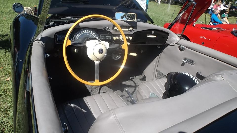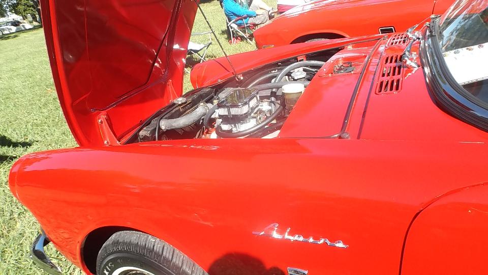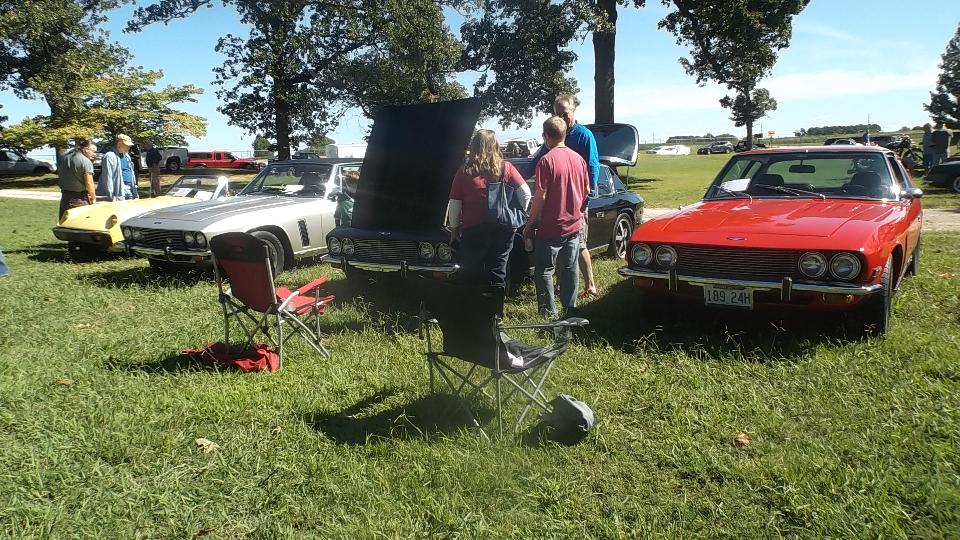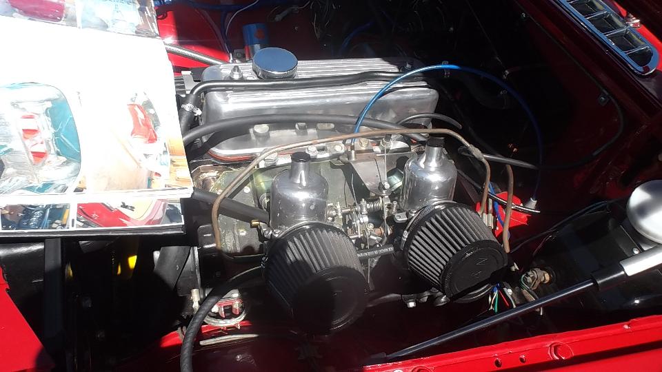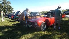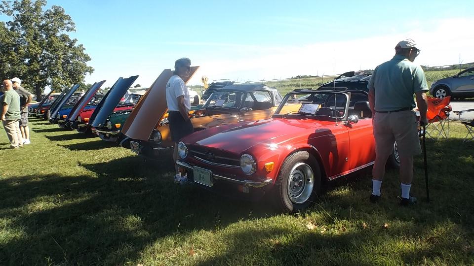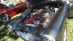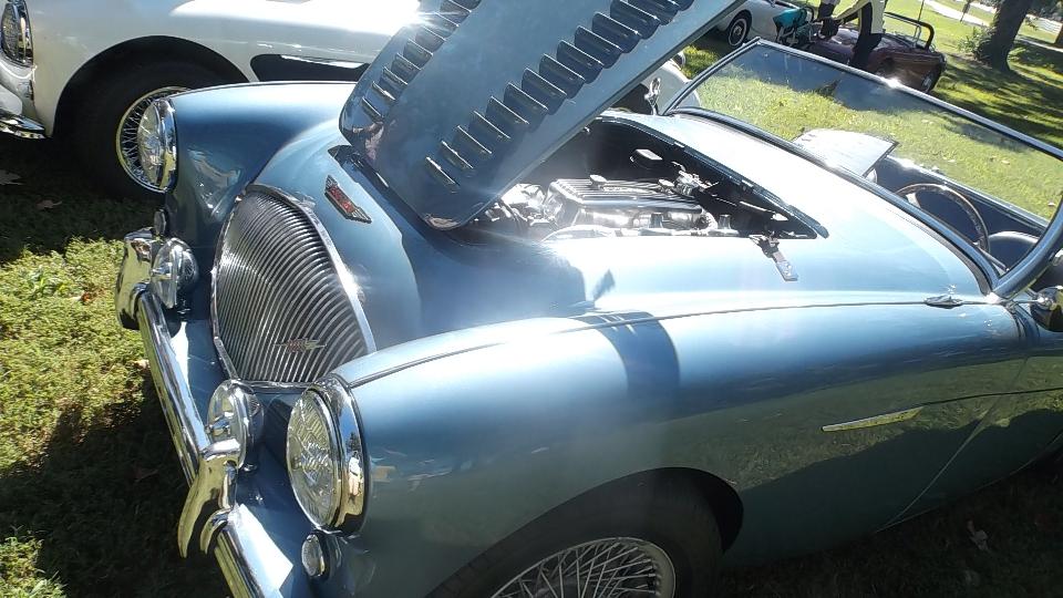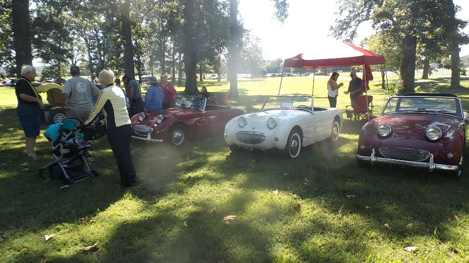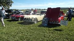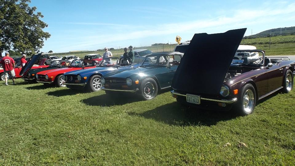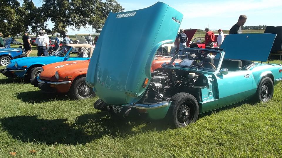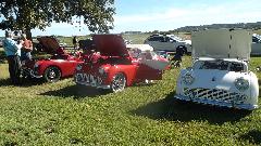 The Model A Ford truck is definitely American, just visiting. The red MGB was one I had tuned up a bit in Kansas City on the 5th of June. At the time it was running hot, bit of a mystery, later turned out to have a bad case of valve recession needing a head job, but all is well now. The Triumph Spitfire is "Ginger" for Drive Away Cancer, kind of a sister car to "Grace" the AH 100.