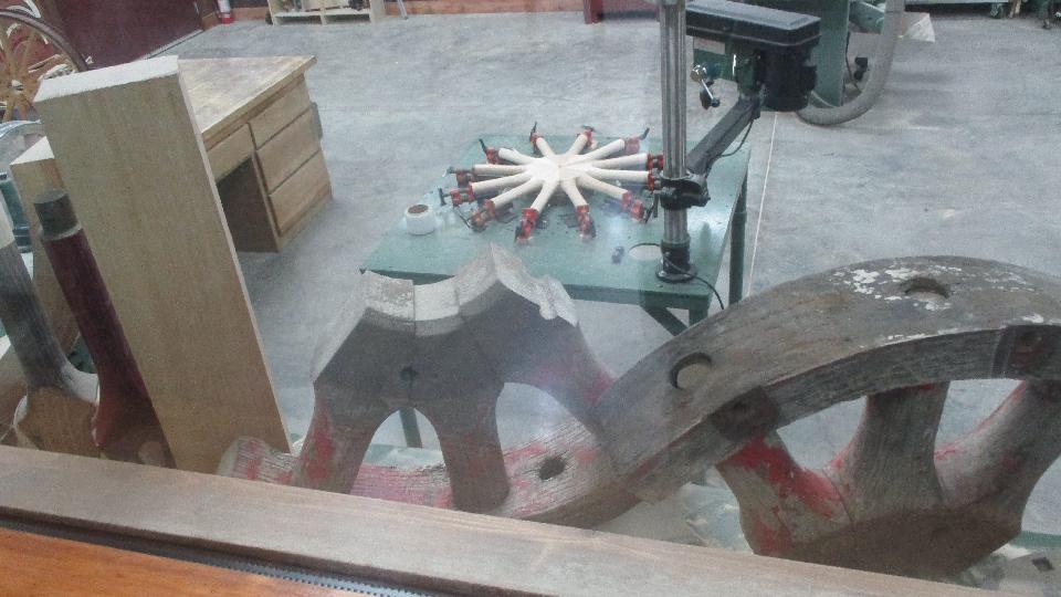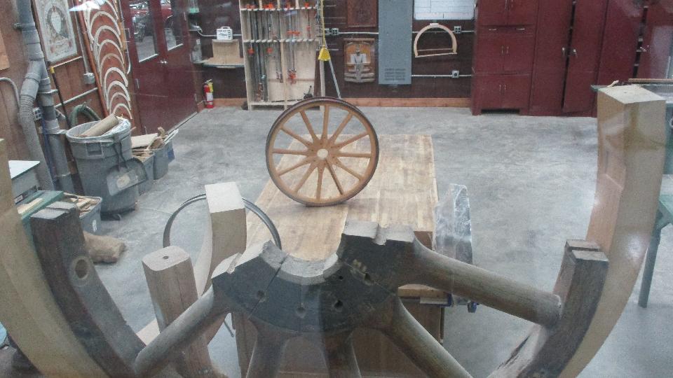 There was a pass by the wood wheel construction shop. Two walls were lined with patterns for almost any wood wheel spoke ever made (maybe twice as many as appear in this picture), so they can be reproduced.