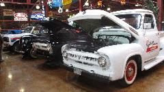 The 1953 Ford truck has been hot-rodded a bit. I used to drive one of those, back on the farm. Notice "Honest Charlie" in various places all about. Some time ago Coker bought them out, and still run the business today. The supercharge roadster was once a 31-day construction project, assembled entirely from H.C. speed shop parts.