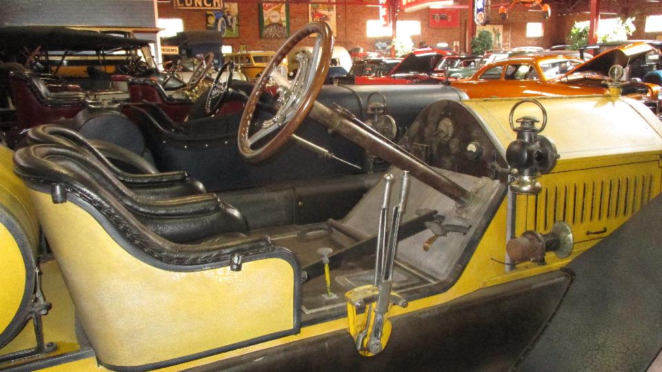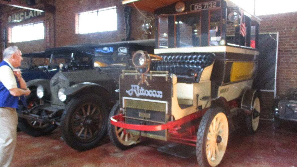 The Autocar has a small engine under the seat, and chugs along about 12-mph. Get on or off while it's moving, so it doesn't have to stop and get moving again. The roadster with underslung frame was so low that it needed huge wheels to have enough ground clearance for the rough roads of the day.