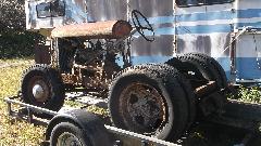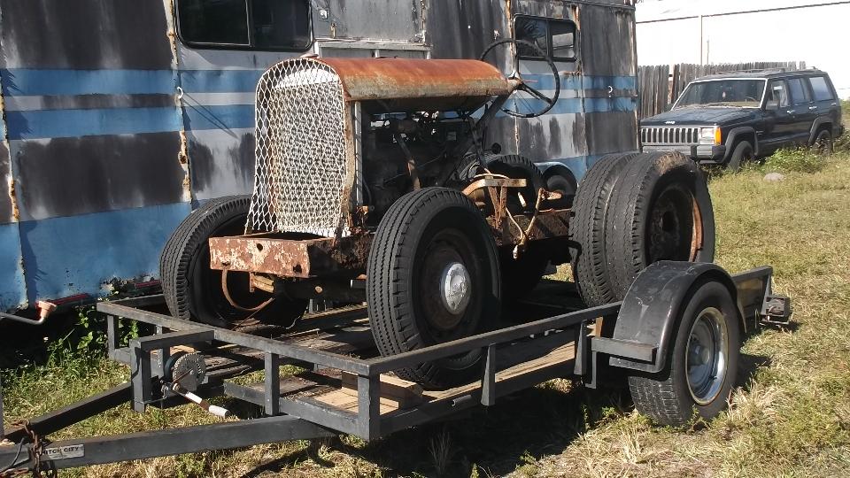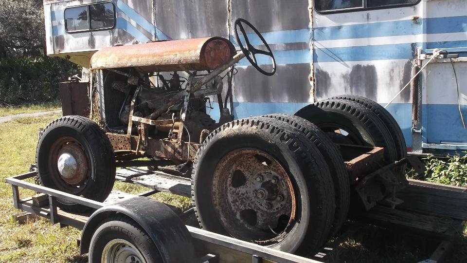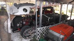 The first "in your face" vehicle appears to be a Ford Model A tractor (looking for a new home). The frame is simple channel iron, and the rear axle appears to be early model truck parts. There are also some Ford flat head V8 engines looking for new homes. Offers?