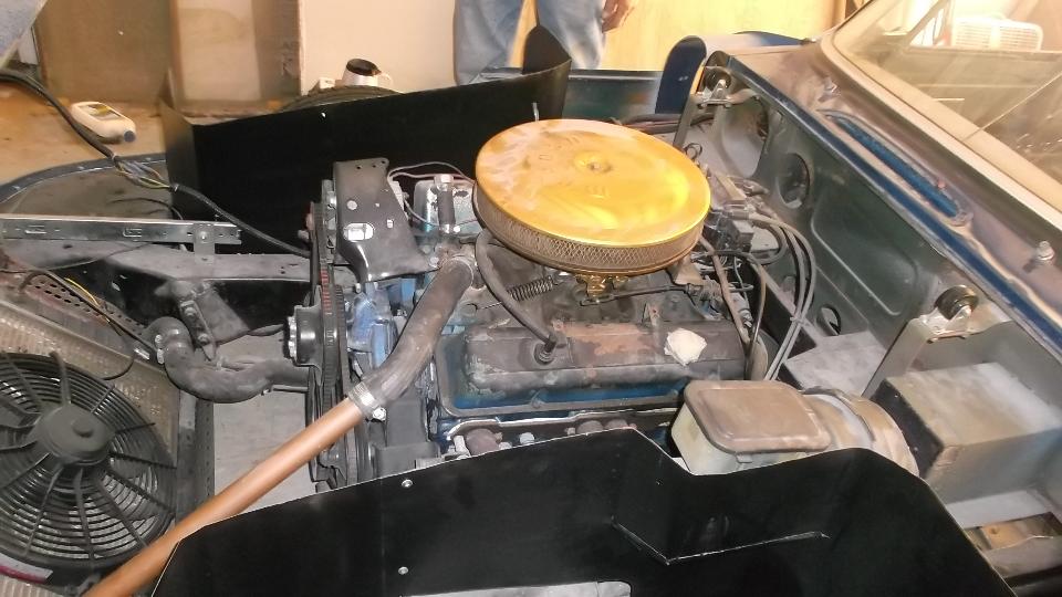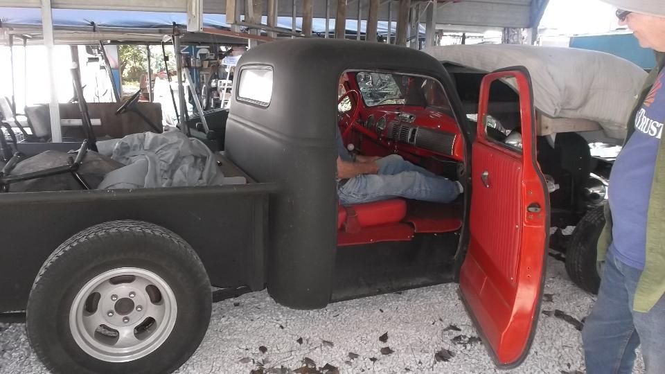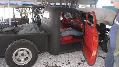 This I believe is a 1950 Ford truck chopped and channeled. The frame is at original height, and seating space is close but adequate (similar to a sport coupe). A tri-power six cylinder, light and very quick. I am told it will spin the tires for about six feet, then bang your head on the back of the cab when it rockets off. (Did you notice the T-bird hardtop)?