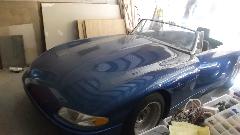Then we have this interesting pair of vehicles. You may need to stare at the pictures for a while to realize what chassis is underneath the outer shell. Don has a company name Custom Coachwork Inc, and he has fabricated these special fiberglass bodies to fit on the MGB chassis. He calls them MGX. The red one has an Oldsmobile engine, and the blue one has a Corvette engine. Wanna play?