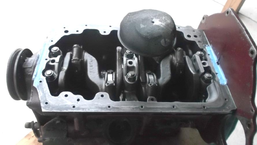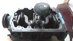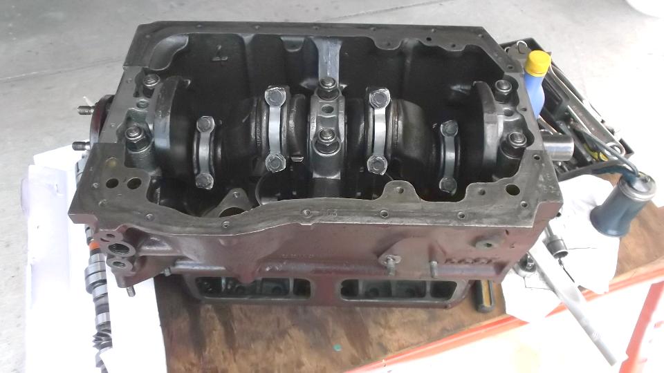4 AM, now we're fully dressed. Oil and water installed, but not primed, spark plugs out. 60 seconds cranking brings oil pressure to 40 psi, using the 100,000 mile oil pump, crankshaft and all crankshaft bearings! Why? Because I am who I am, and I don't throw away good parts.
