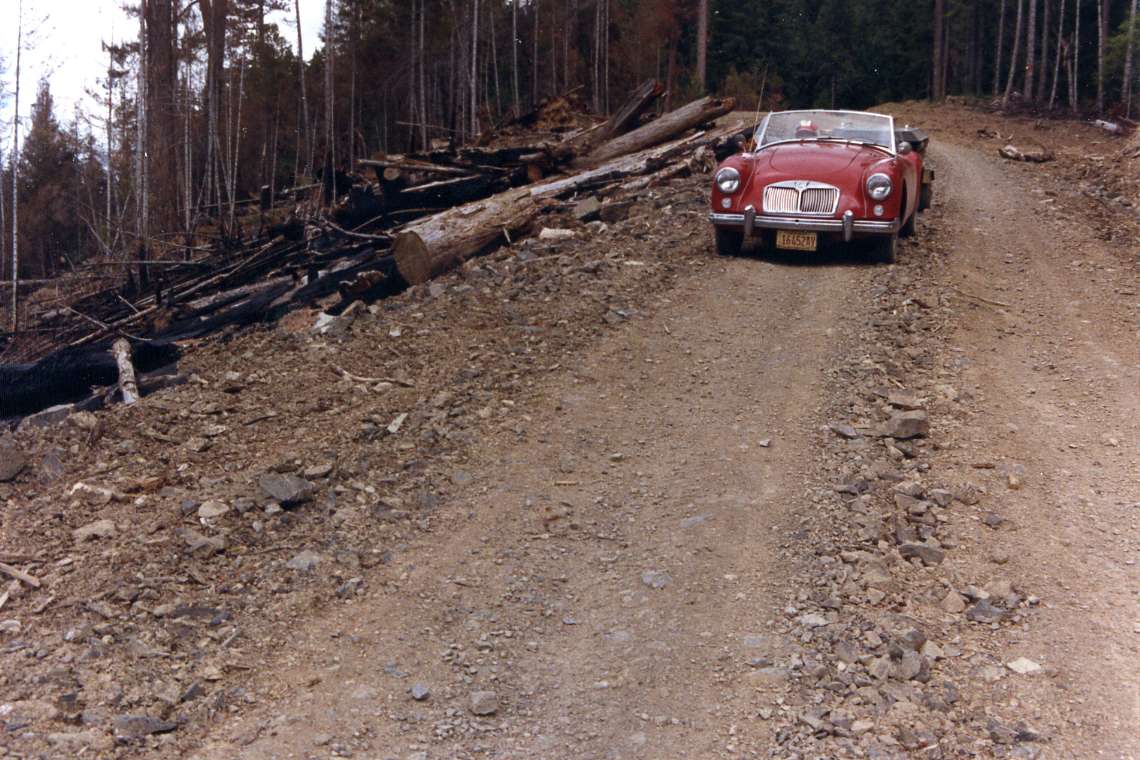 That picture is exactly what it looks like, one of my favorite little logging roads in Oregon. It was used by skip loaders and semi trucks to haul logs out of the forest. I was cautiously driving in the wide tire track on one side to avoid straddling the ridge. Even so we did catch one of the rocks under the car, and an hour later we were in Grants Pass getting a small hole in the fuel tank soldered shut.