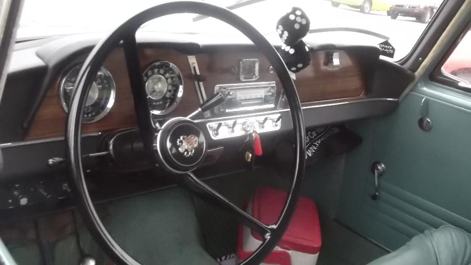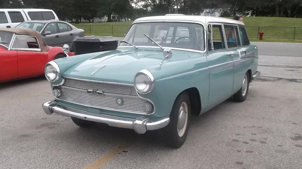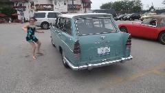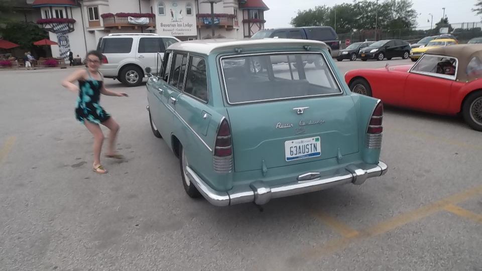 After dinner, in the cool of the evening, I had a surprise visitor. Brock Dittrick noticed I was in town and drove about an hour to see me (and check out the other rolling stock of course). He brought his family along in his 1963 Austin Cambridge Countryman. It has an Austin B-series 1622cc engine (another varient of MGA?). It may be the only one in North America with an automatic transmission (and it still works).