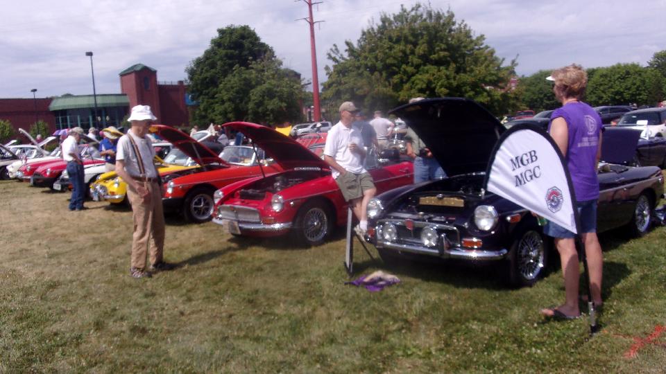 In the evening we attended the First-Timers and Welcome Party (combined this year). Had an extended chat with a newcomer, and more chat with a bunch of old friends and a few new ones, and got to chew the rag with John Twist for a while. As the light was failing I had another stroll round the car park to check out new arrivals. Lew Palmer is selling his 1936 MG PB Airline Coupe (in case anyone might be interested). There was a nice factory issue 1976 MGB GT V8 (mostly original). Also a nice MGA with an "oops" in front from rear ending an MG Magnette on the way to the event (both cars with the same owner).
