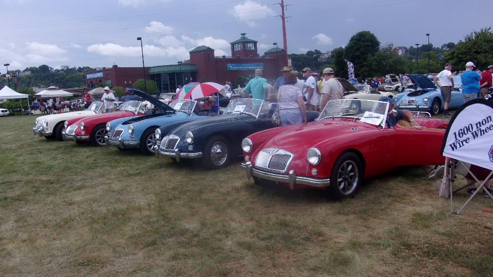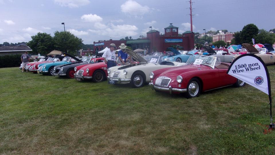 Next row forward was MGA 1600 non-wire-wheel cars, sort of a small class (five cars?), likely a result of so many people converting these cars to wire wheels. Also note that most of these are not using original steel wheels. Then a full row of 1600 wire wheel cars, several with non-standard chrome wheels (period correct accessory parts), and a few with optional wide whitewall tires.