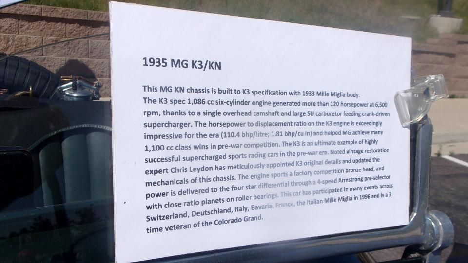 Below, a 1935 MG K3 Magnette (based on the KN chassis). I'll let you read the fine print, but it is bloody impressive for a tiny 6-cylinder engine from way back.