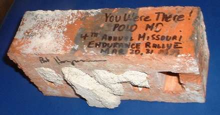 When we awoke, and handed in our proof, and the rallymaster checked our mileage, and made sure or licenses were safely tucked away in their envelopes, we waited. A hotline had been set up for emergencies. A few participants had called in to say that they had become lost and gave up; one knew that he would not finish before the deadline and opted to head home instead. Some we never heard from. While we waited we all signed the brick from Christ Church and gave it to Barney as a memento. The mileages were written on the sheet and corrected using the factors determined yesterday? It seemed like last week. After correction, our mileage was the lowest. But what about that checkpoint? Several of us looked at each other but no one said anything until somebody asked Barney about "that checkpoint" complaining they couldn't find it. Relief: there were at lest two of us. The rallymaster acknowledged that he had an older map that showed that