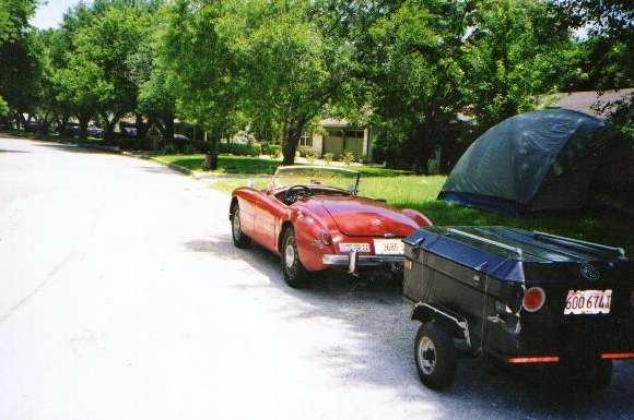 First day out on the Alaska trip, the MGA with an attitude was run off the road by a semi truck and forced into a guard rail. The car took a solid side swipe, and the fiberglass luggage trailer took a beating, flipped over, drug around the pavement, badly cracked and scratched. Undaunted, attitude will prevail. The following is a e-mail message sent to friends as a trip update.