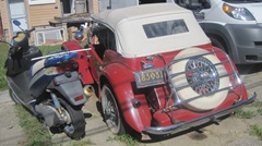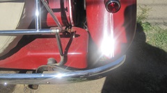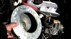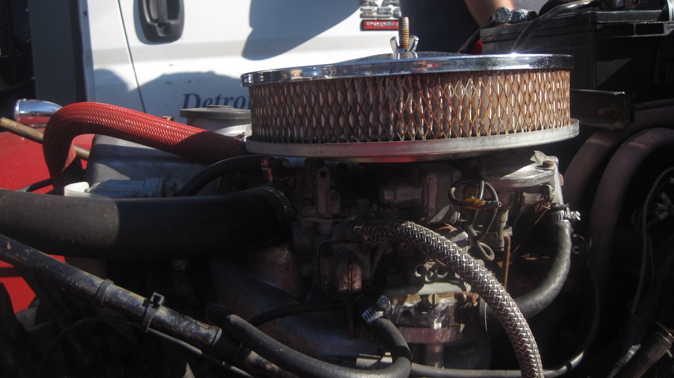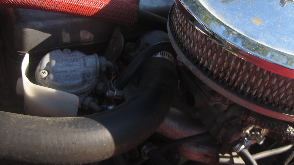 Got the keys, switch on, pull to start, it cranks well, good battery and starter, no fire. We sprayed a little starting fluid in the carburetor and cranked again, still no fire, not even a single pop. The owner put a gallon of fresh gas in it, crank gain, still no fire, so he called his mechanic who was fairly close at hand. Mechanic switches key on, ten seconds of fiddling, pull start, and it fired right up. What? Turn this little black knob until that little yellow light comes on, for ignition, then start. Okay, goodbye. Now it was running, but if I don't know how to start it, I don't have enough courage to try driving it. I did notice that the air cleaner with 5-inch bottom aperture did not match the carburetor with 3-inch top aperture, so no seal between the air cleaner and carburetor. People have been driving this car?