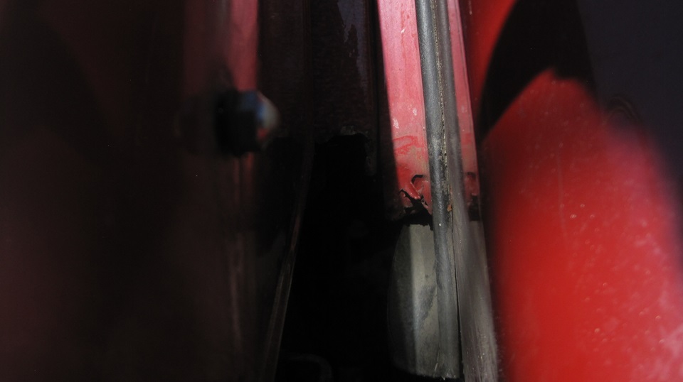 Tail end of the RF wing, sans running board. If you poke the bottom edge of the sill, it is thin and flexible, must be rust behind the paint and Bondo.