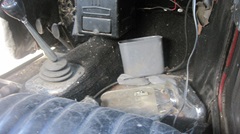 Interior a bit tatty, dirty, begging for fresh carpet, some harness wiring hanging free. Shifter lever is standard 4-speed H-pattern , push down, then left and back for reverse, don't know what gearbox it is.