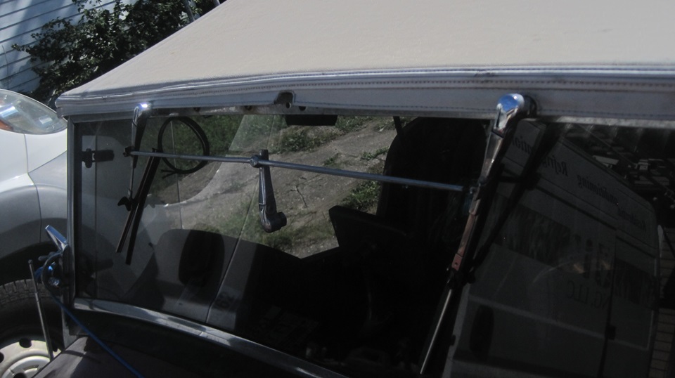 Picture of the tail end of the LF wing with large paint blisters on the outboard edge. Rag top not fastened down on the left side. I pushed that down on the peg and tightened the retaining wing bolt inside. Then looking at the disconnected wiper drive, no wiper motor inside, so no spindle to attach the center drive arm.