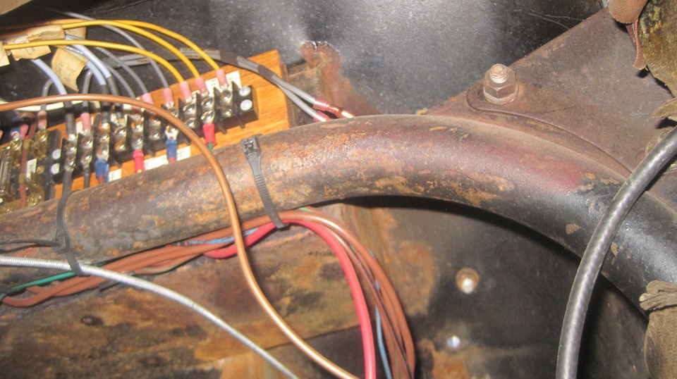 Picture of the pull start switch near the battery, and some of the aftermarket wiring on a barrier strip. Non-standard wire colors, so it could take a while to figure out the current wiring. It may be more desirable to install a new original type wiring harness, along with a full restoration, maybe? Hint, hint.