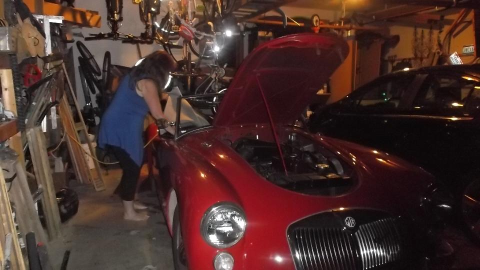 Next stop was for an appointment with Jeff and Morgan Battisti and her 1961 MGA on the north edge of Columbus, OH. What we have here is a family of car enthusiasts, not all MG fanatics, but we may make some more converts yet. We had jolly good fun nit picking at the MGA in the dark garage, to find some irregularities and some possible improvements, but in fact it is a daily drive car as it sits. We will take another look at the car by daylight.