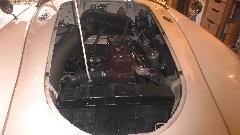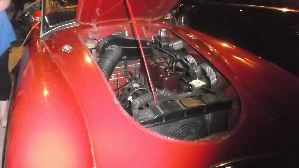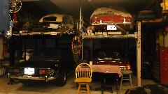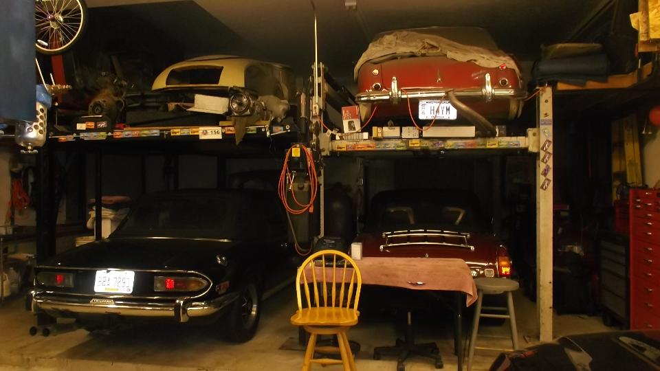 We arrive a little early, just time enough for a quick dinner and pick up some ice, then head over to Ralph's place around 9:00 pm. We find that Ralph has a penchant for stacking things, like little British cars for instance. There is an MGA project car body in process above the black MGB. There is most of an MGA Twin Cam above the TR Stag. There is the AH 3000 above the MGB V8 car. Too many toys, of course.