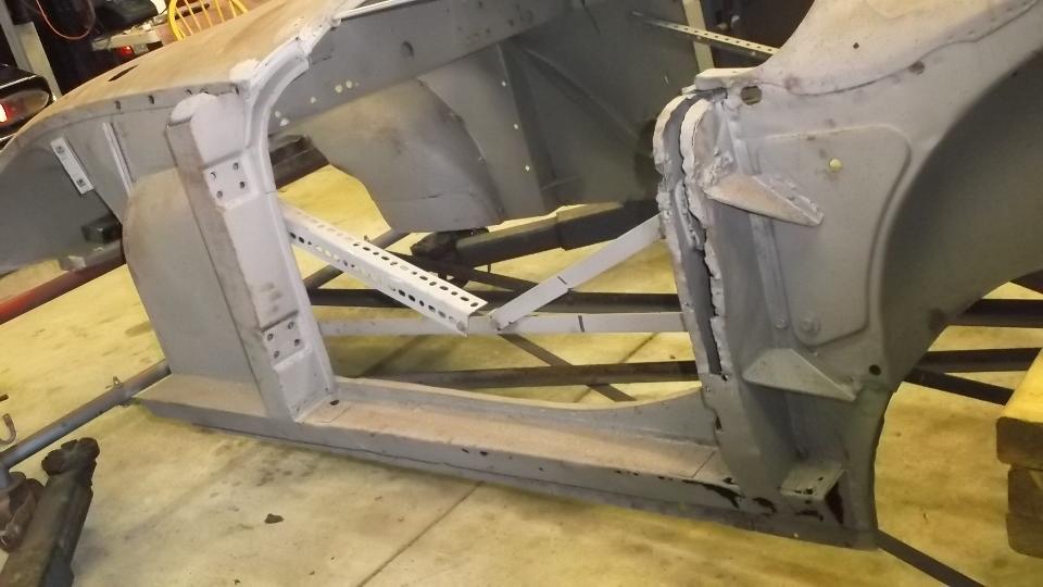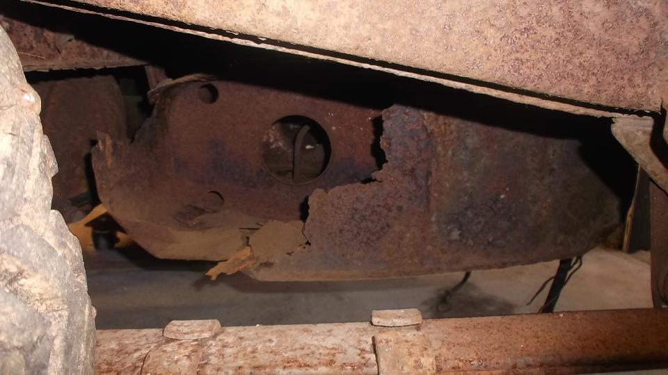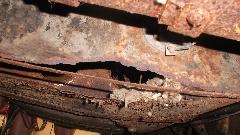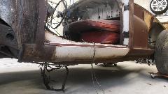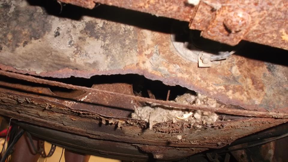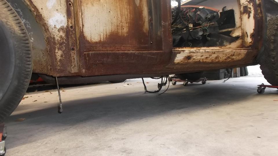 Top surface of the main body shell has long since been stripped to bare metal and is loaded with surface rust. Rocker panels and inner body sills are paper thin with finger size rust holes and will need to be completely replaced.