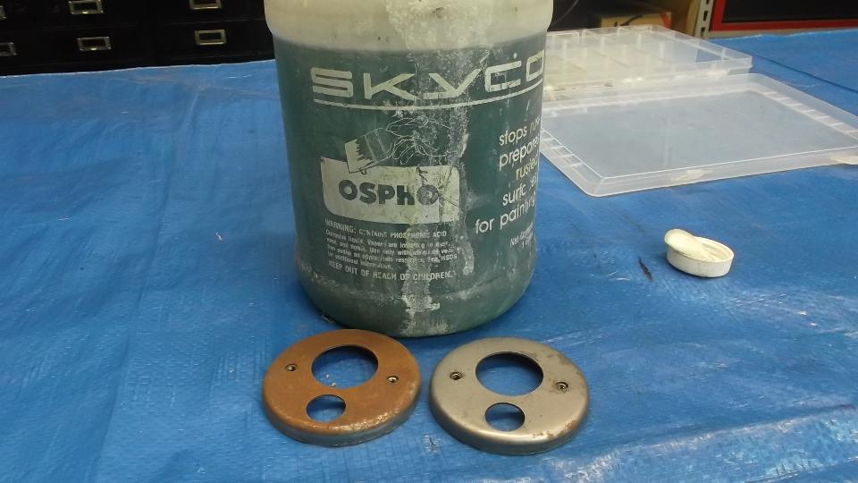 First tech session of the day, for steel parts with surface rust, try a little rub down with Skyco Ospho. This is dilute Phosphoric Acid, and it works well to remove light rust. Heavier rust may require some soaking time before a brush down.