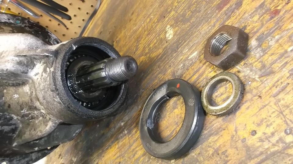 to allow removal of the pinion shaft. A used assembly will have somewhat loose running bearings, so it is common to need to reduce the shim stack to restore the proper specified preload for the pinion bearings. Without factory type set-up tools, repeated test fitting with various shims is the prescribed method. Too loose remove a shim, To tight, then increase shim stack. Desired end result is 1-lb-ft (12-lb-in) torque to rotate the pinion shaft with no shaft seal in place. When preload is correct, then remove the flange once more to install the seal, and reassemble.